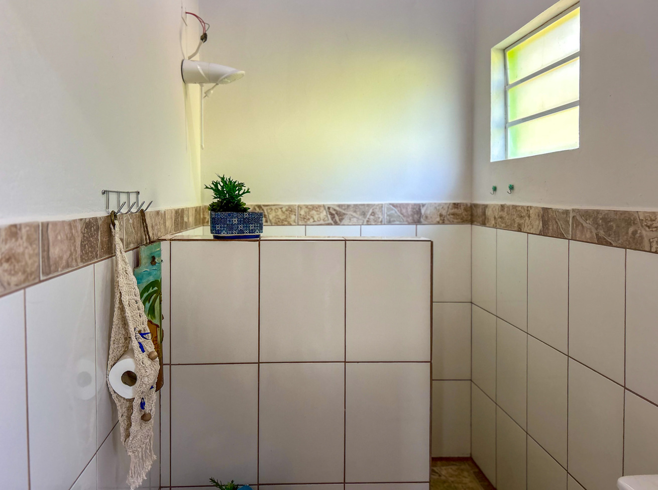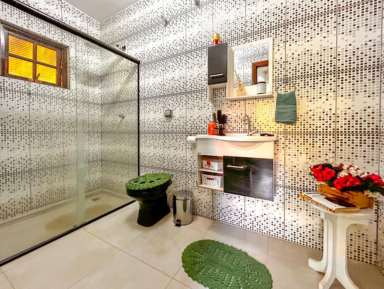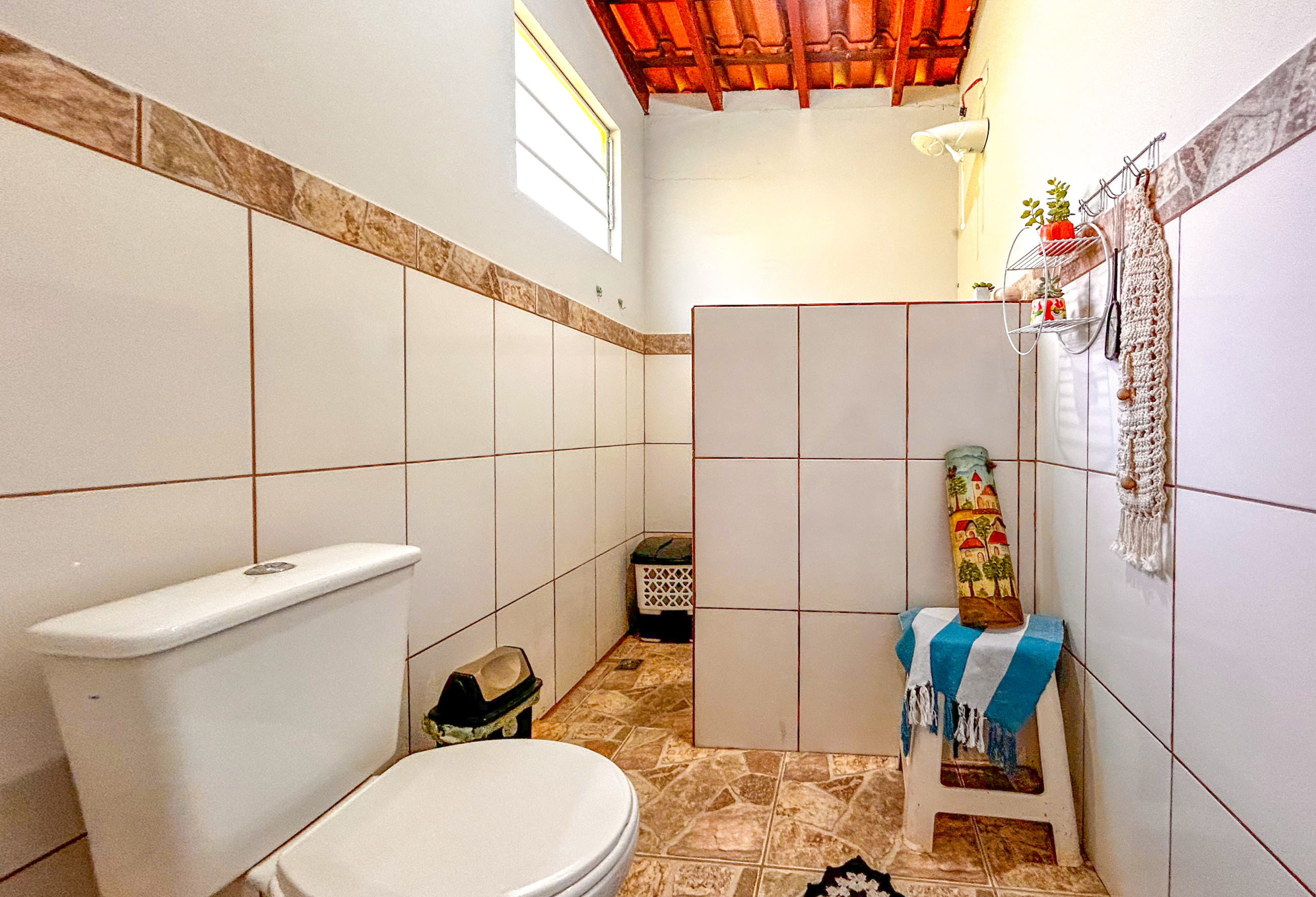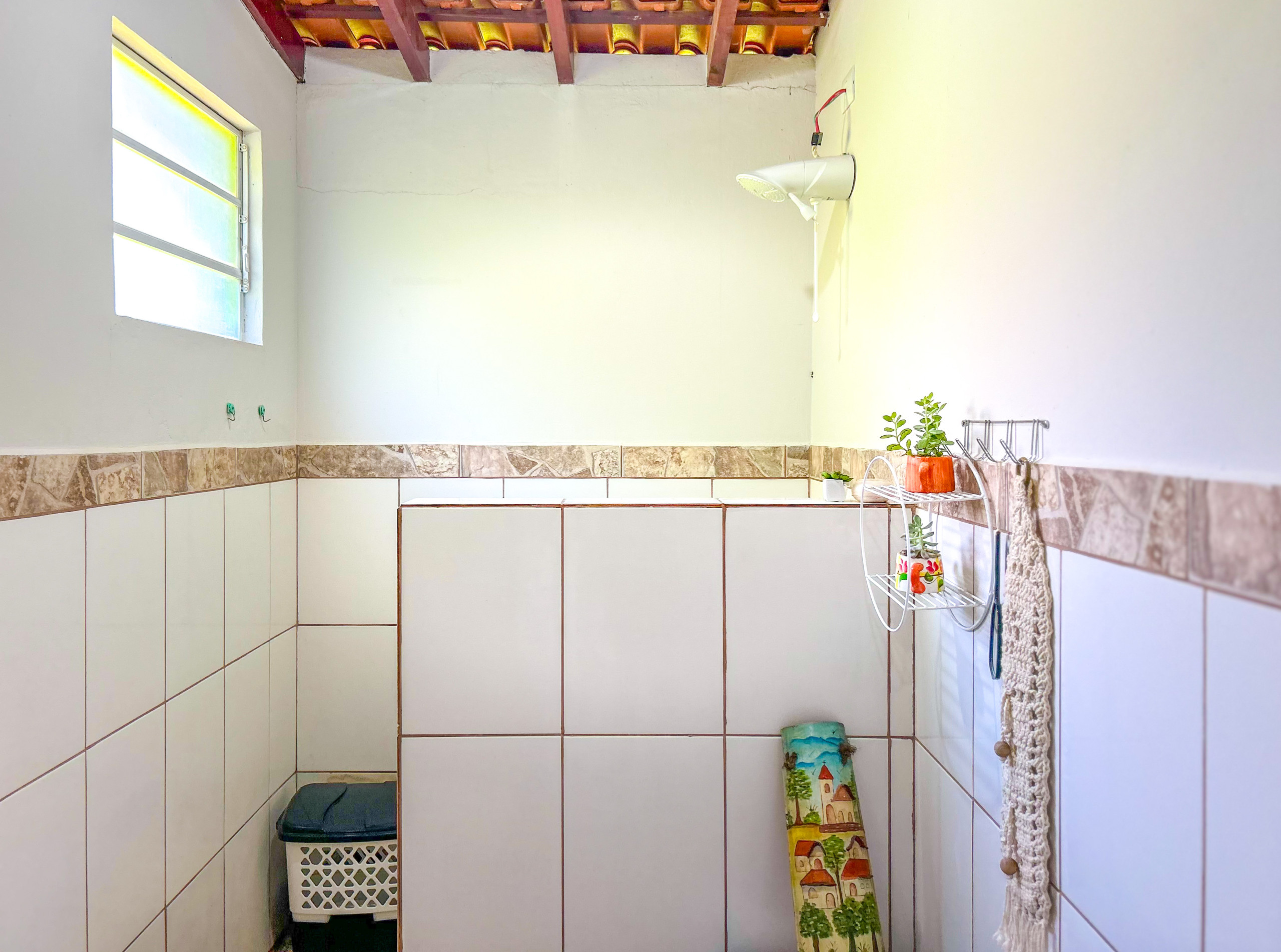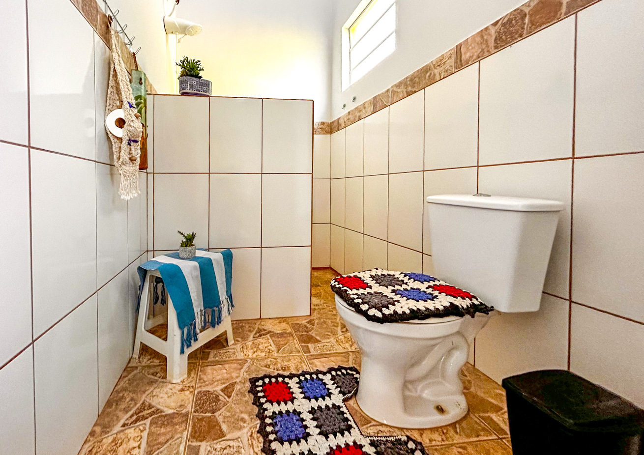- Os banheiros têm chuveiro elétrico, box de vidro/acrílico ou cimento e secador de cabelo