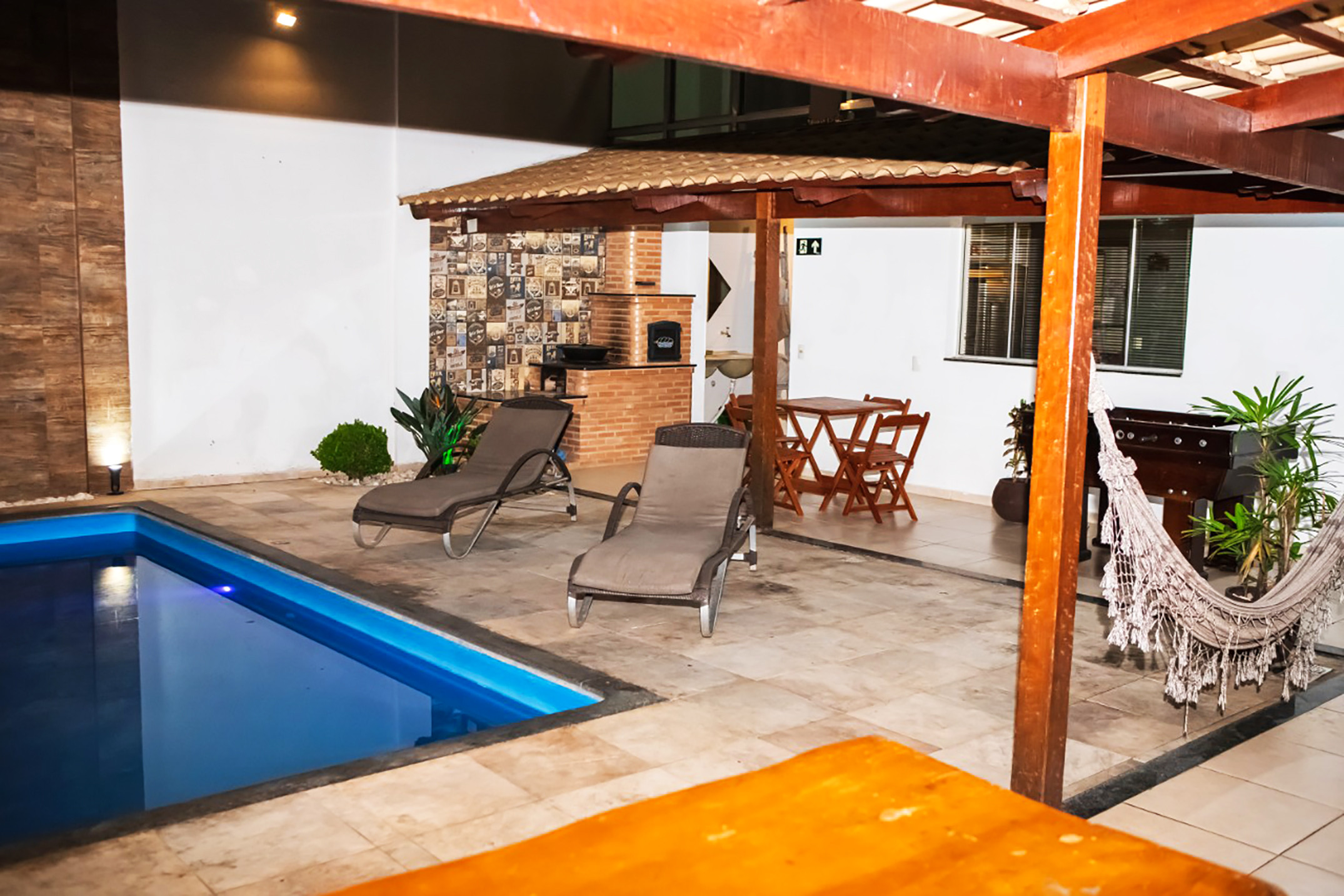 - Disponibilizamos espreguiçadeiras, mesa com guarda-sol e uma ducha para as higienizações pré e pós piscina