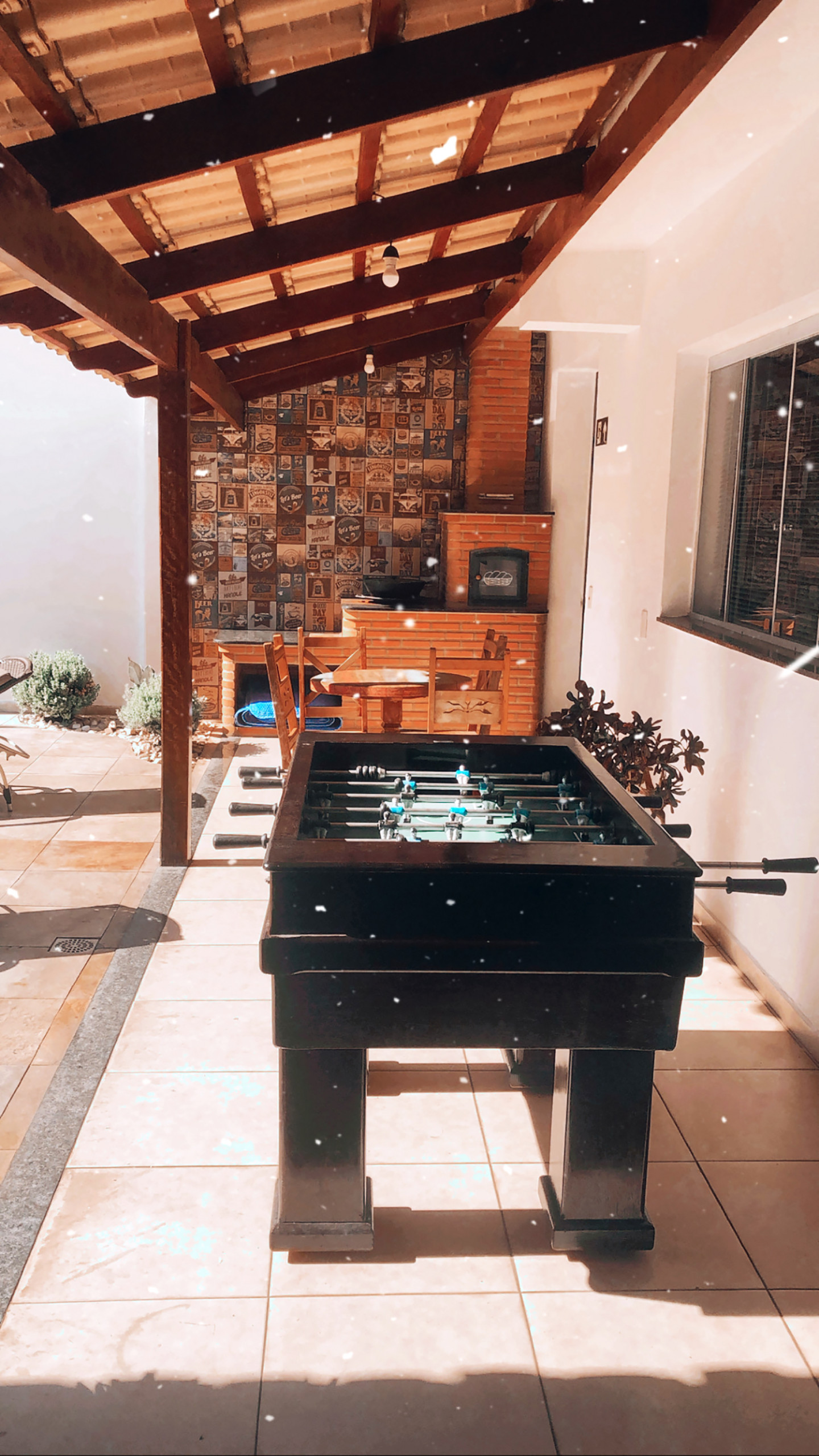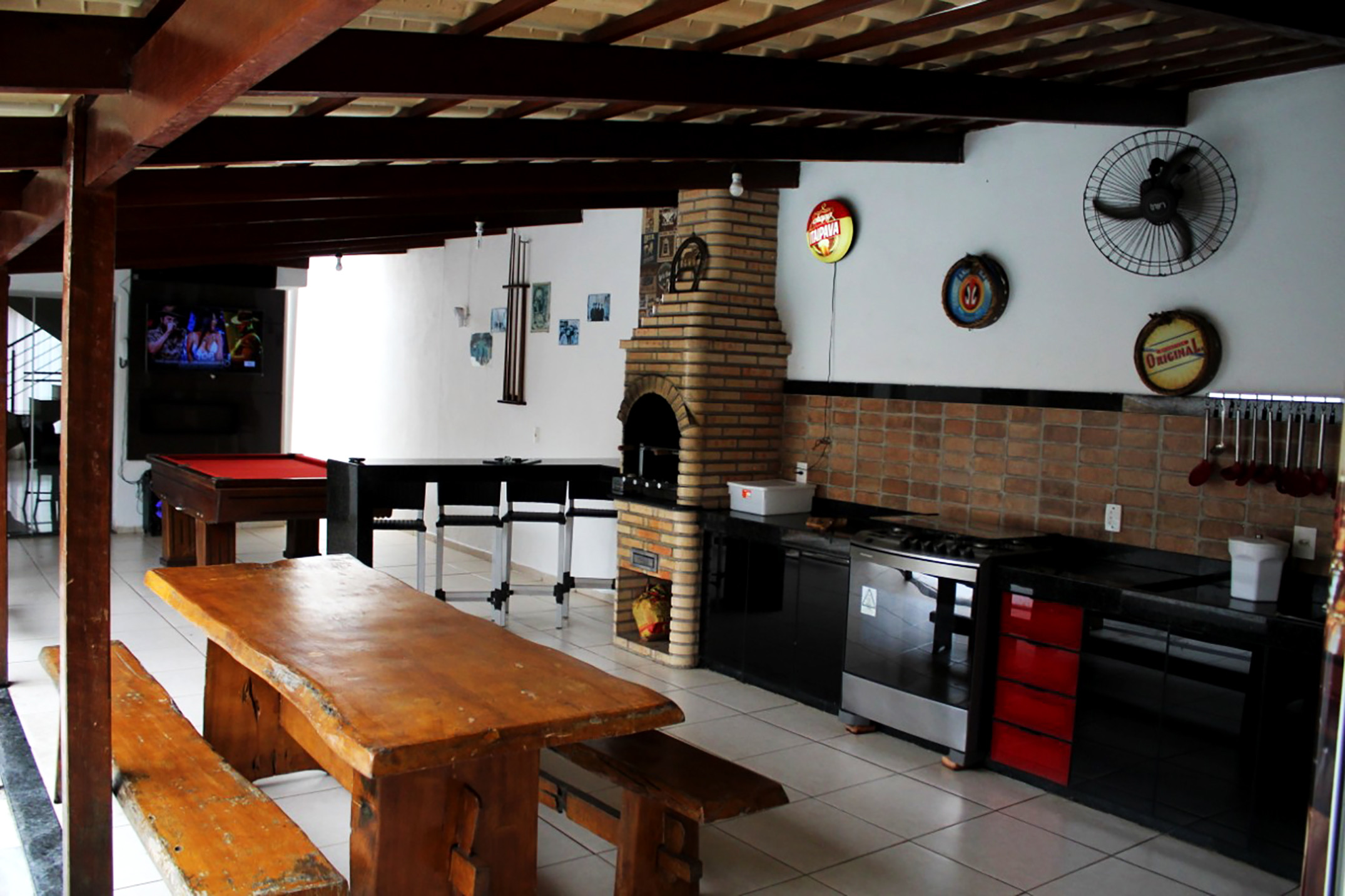 - Área gourmet equipada com freezer vertical, uma mesa estilo picnic e um balcão com quatro banquetas