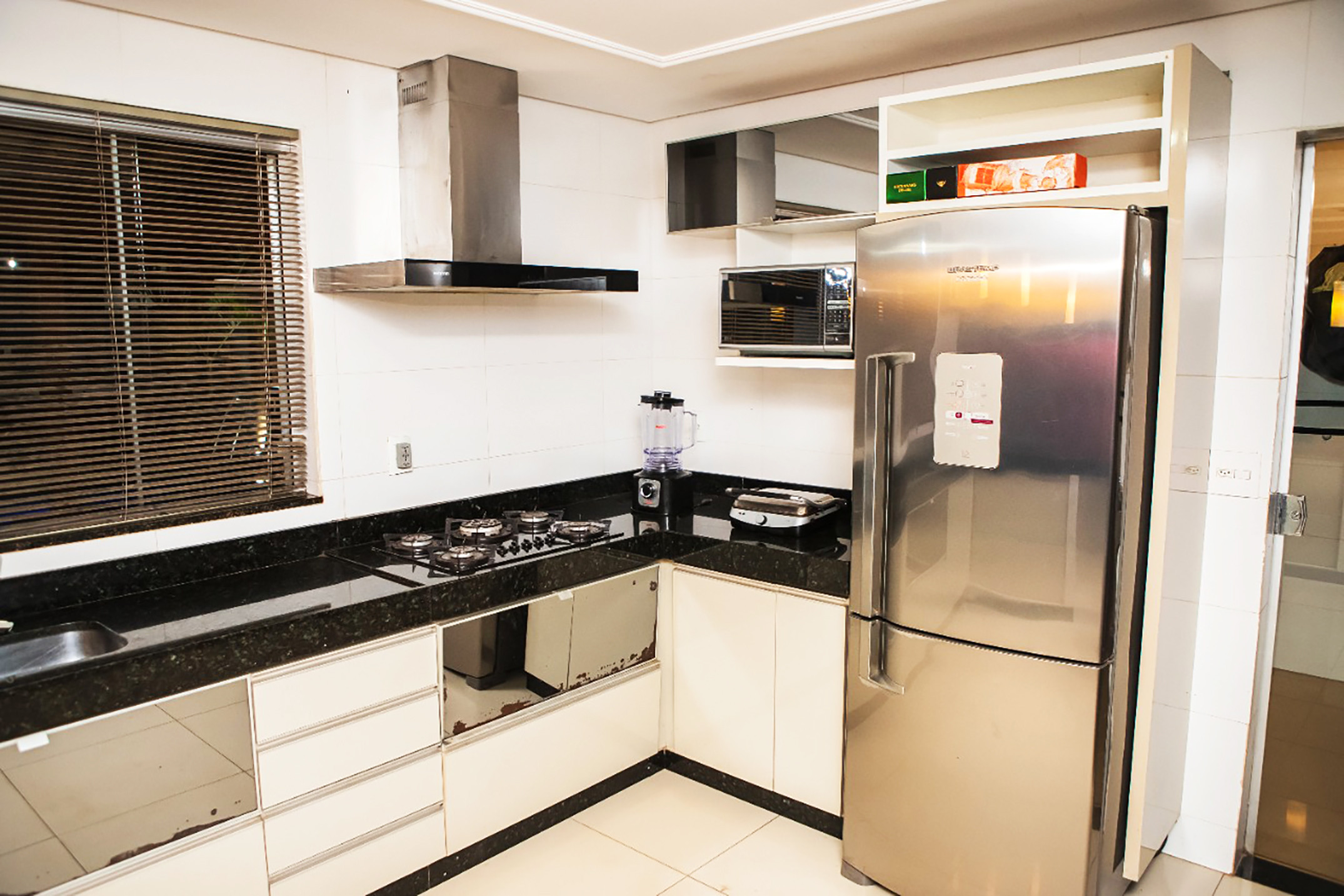 - A cozinha é altamente moderna e equipada com tudo o que você precisa para preparar as suas refeições, incluindo cooktop com exaustor, geladeira by side, micro-ondas, liquidificador, fritadeira elétrica e cafeteira