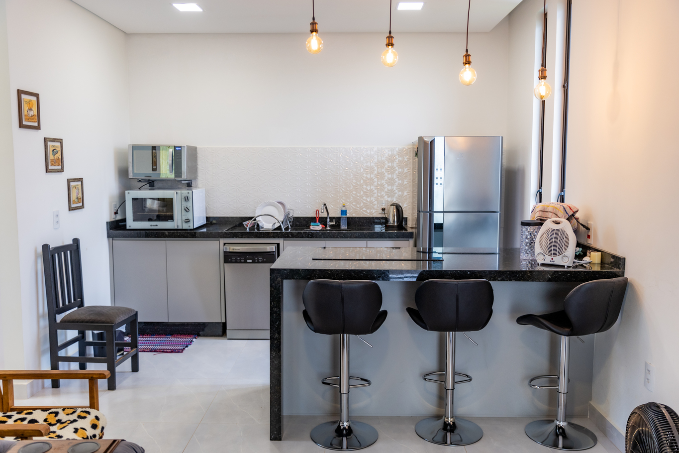 - A cozinha é equipada com diversos utensílios necessários para preparar deliciosos pratos, incluindo chaleira elétrica, cafeteira, freezer, fogão de indução, forno elétrico, geladeira, liquidificador micro-ondas
