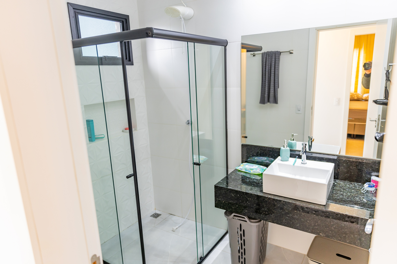 - O banheiro possui chuveiro elétrico, box de vidro e secador de cabelo