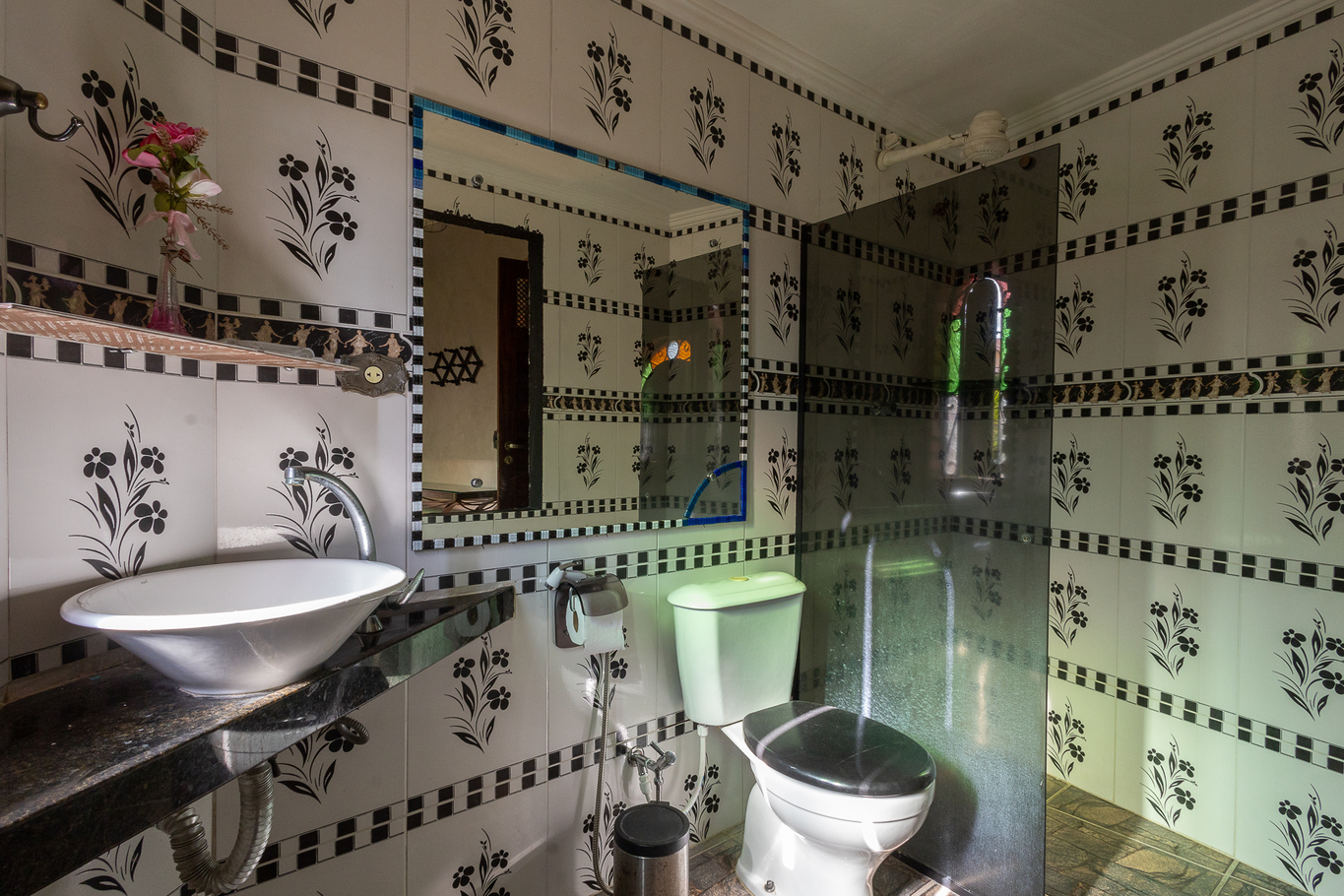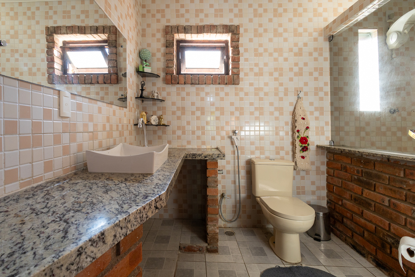 - 5 banheiros com chuveiro elétrico, pia e espelho e 1 lavabo