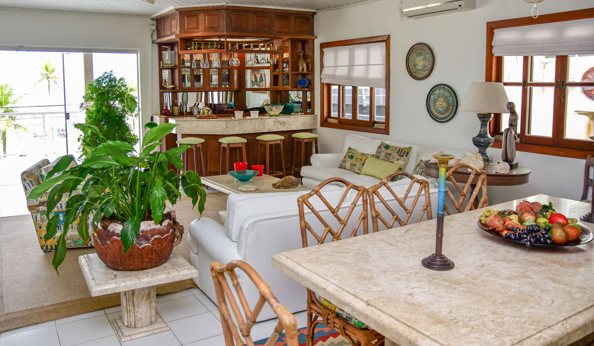 - Sala de estar equipada com cadeira, mesa de centro, poltrona, sofá, ventilador de teto, aparelhos de ar-condicionado e ampla varanda de frente para o mar