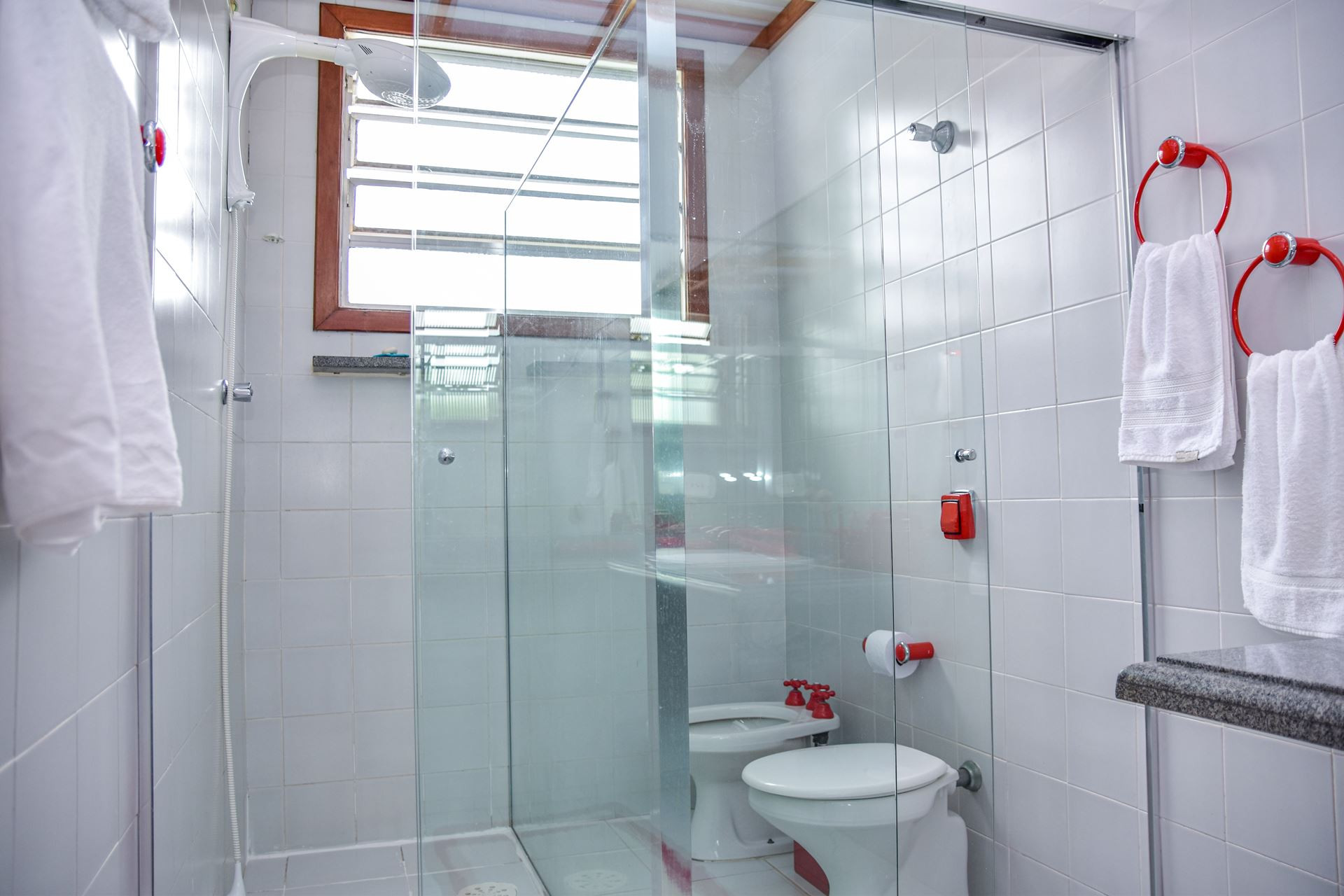 - As suítes contam com 1 cama de casal, armário, edredom / cobertor, protetor de colchão, ventilador de teto, chuveiro elétrico e box de vidro/acrílico