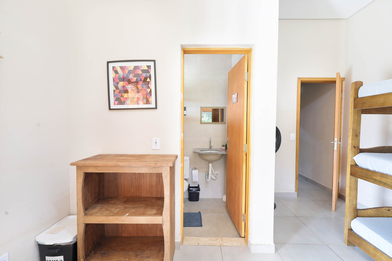 - Na suíte 1, há 1 cama de casal, 1 beliche e 1 treliche com chuveiro elétrico e não há box