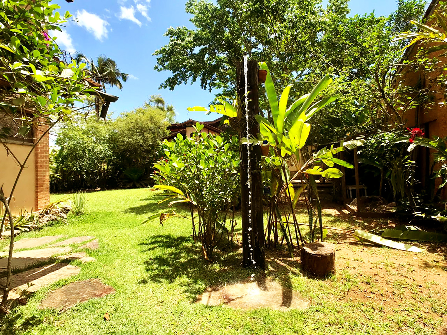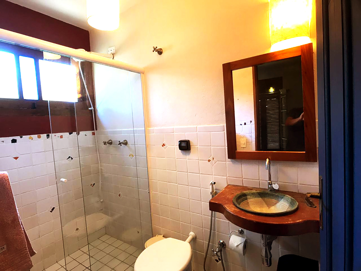 - O banheiro da suíte tem espelho, ducha higiênica e chuveiro com box de vidro, enquanto o banheiro no térreo tem espelho e box com chuveiro e divisória de vidro. Toalhas de rosto e banho são fornecidas durante sua hospedagem