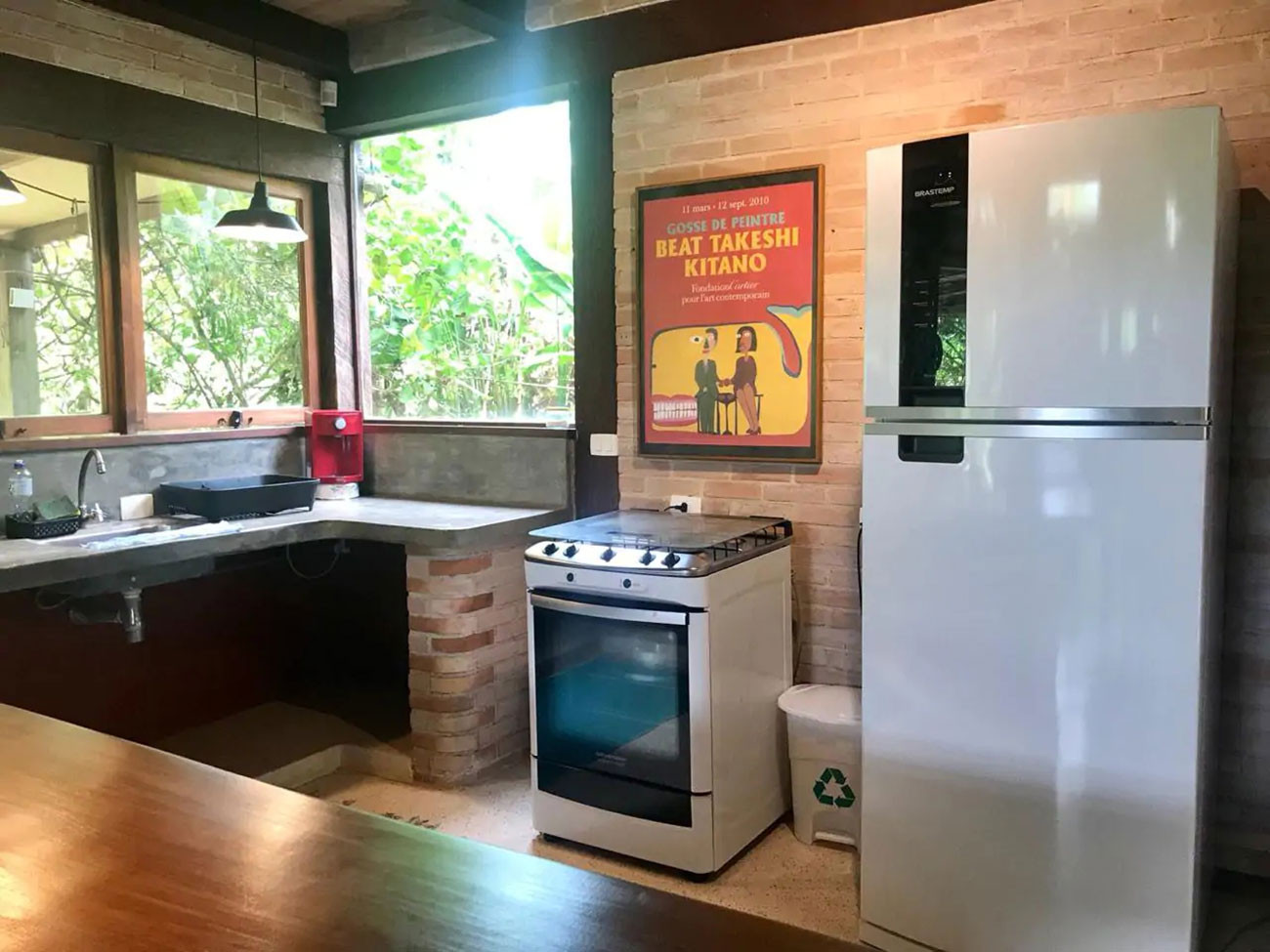 - A cozinha está equipada com um grande balcão, geladeira, freezer, forno, fogão e liquidificador