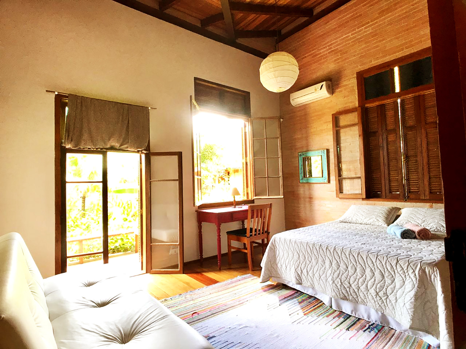 - No quarto você encontra 1 cama queen, travesseiros, edredom, armário com cabides e uma mesa de trabalho com cadeira, além de um quarto infantil