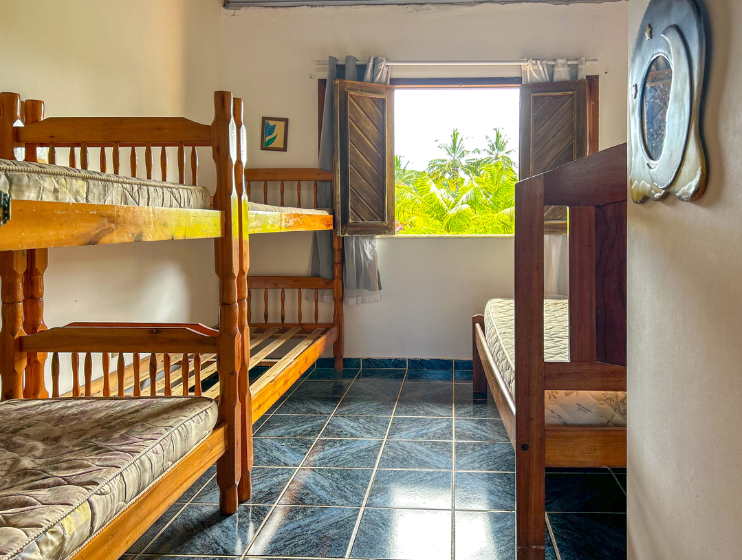 - No quarto 2 há 1 cama de casal, 2 beliches e 1 colchão extra de casal
