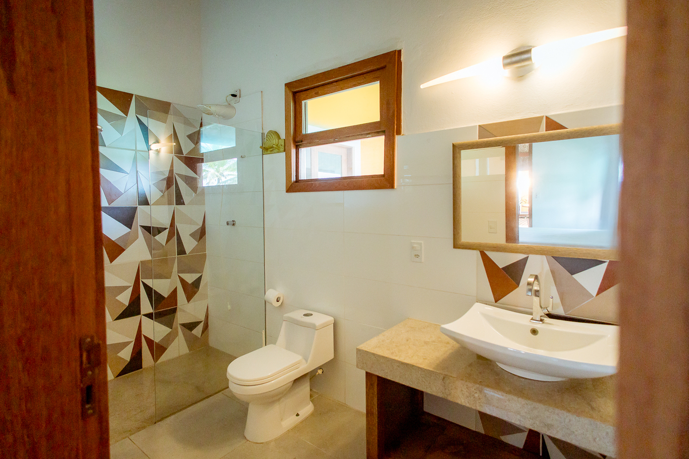 - O banheiro tem chuveiro elétrico e box de vidro/acrílico