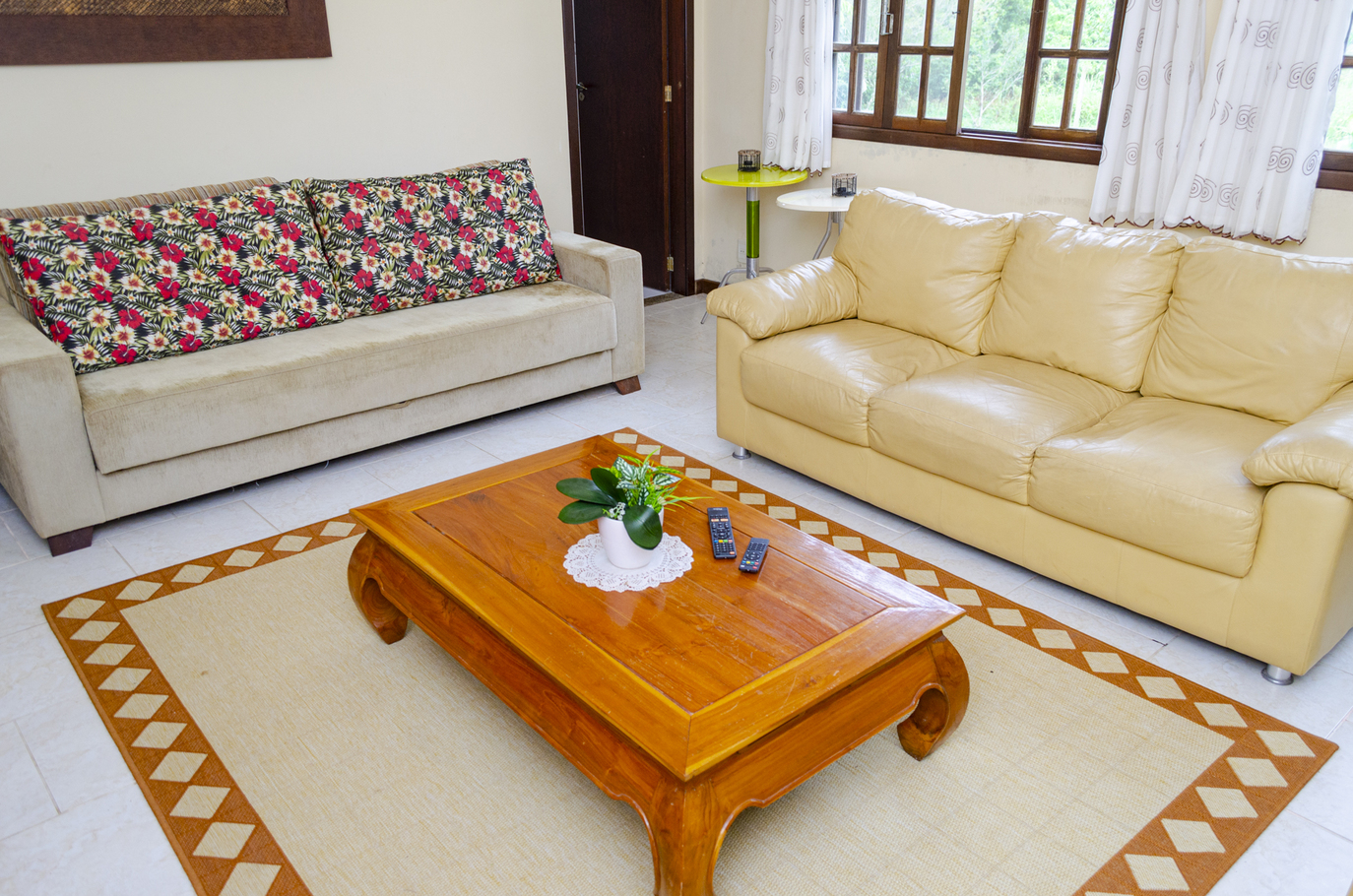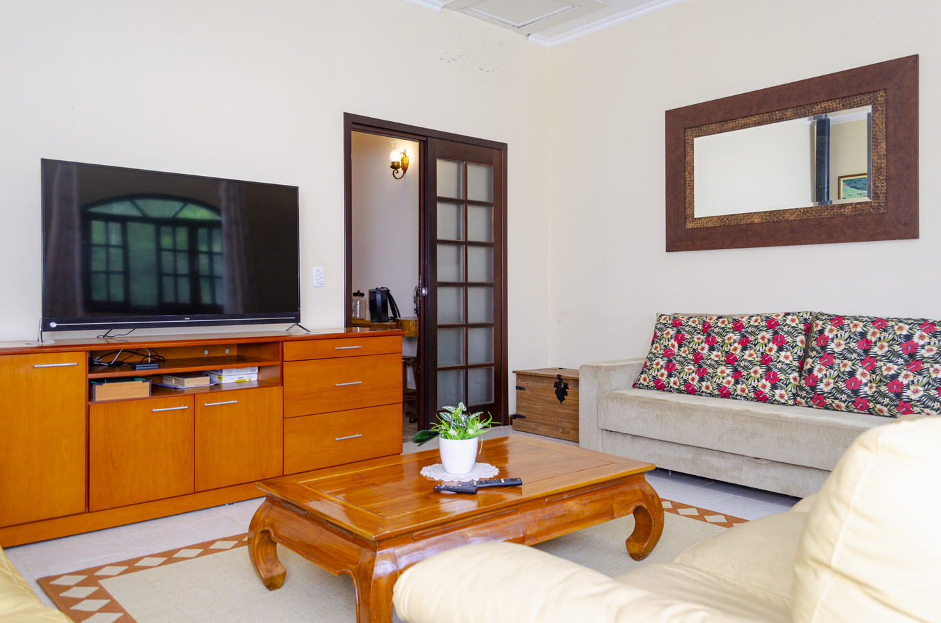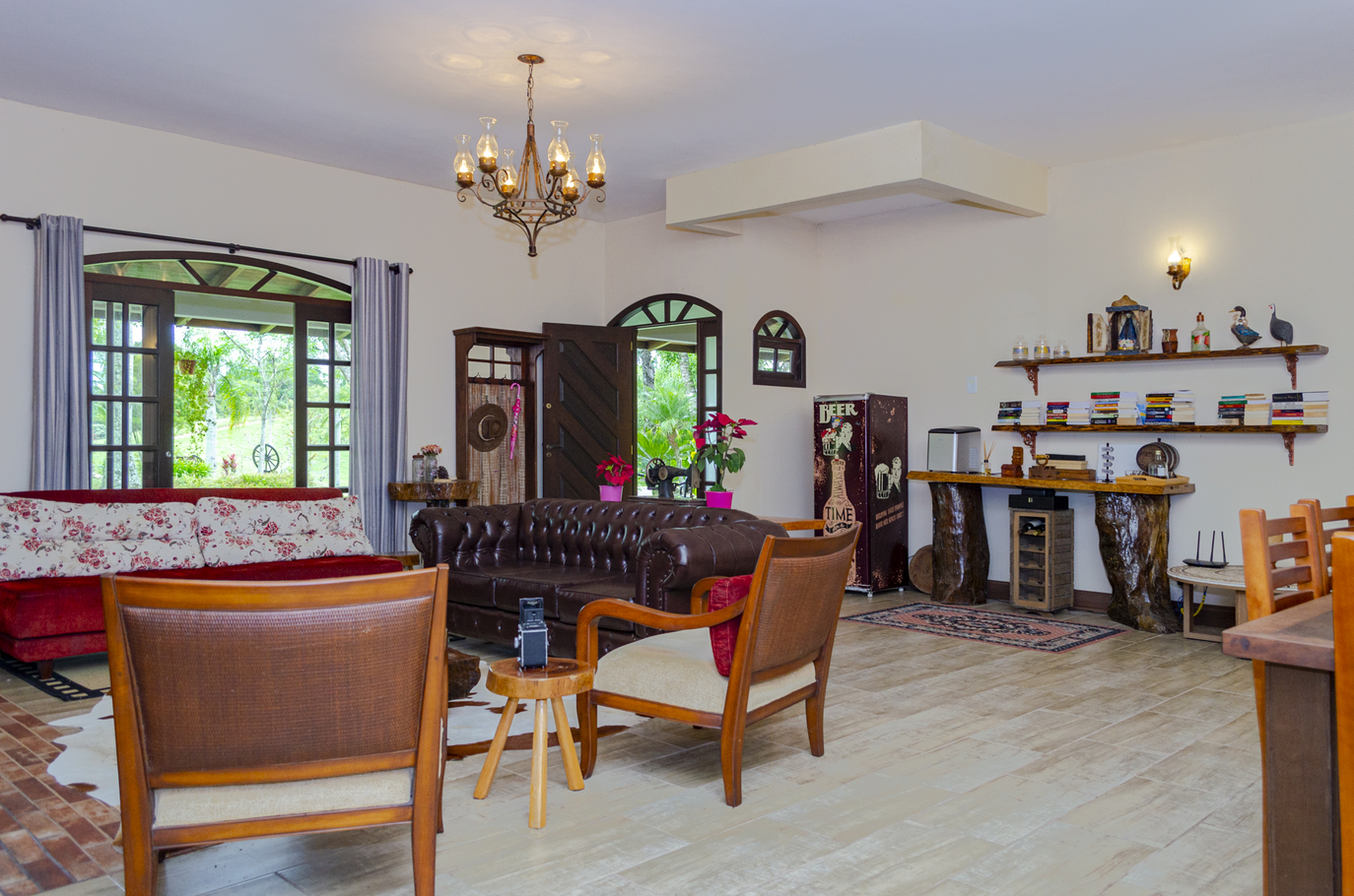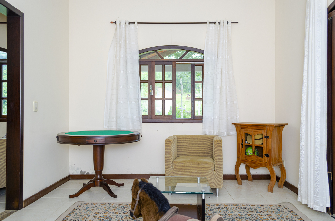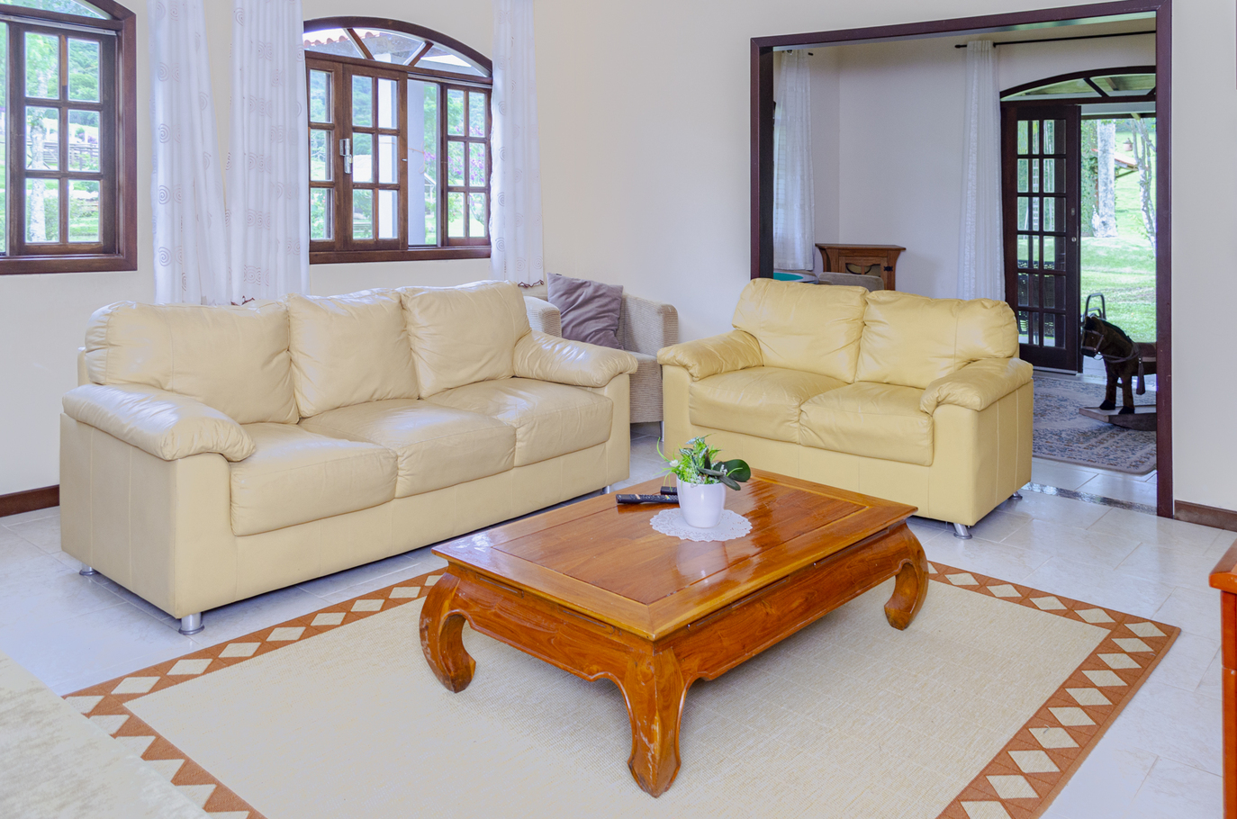 - A sala possui cadeira, mesa de centro, poltrona, sofá, sofá-cama