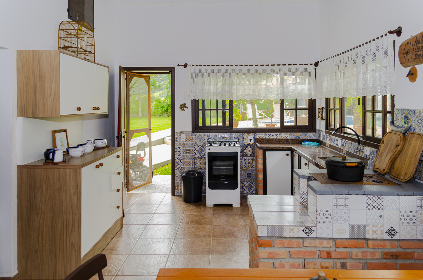 - A cozinha possui diversos utensílios necessários para preparar deliciosos pratos, incluindo cafeteira, fritadeira, fogão, forno, geladeira, liquidificador, microondas e airfryer (exceto sal, pimenta e óleo)