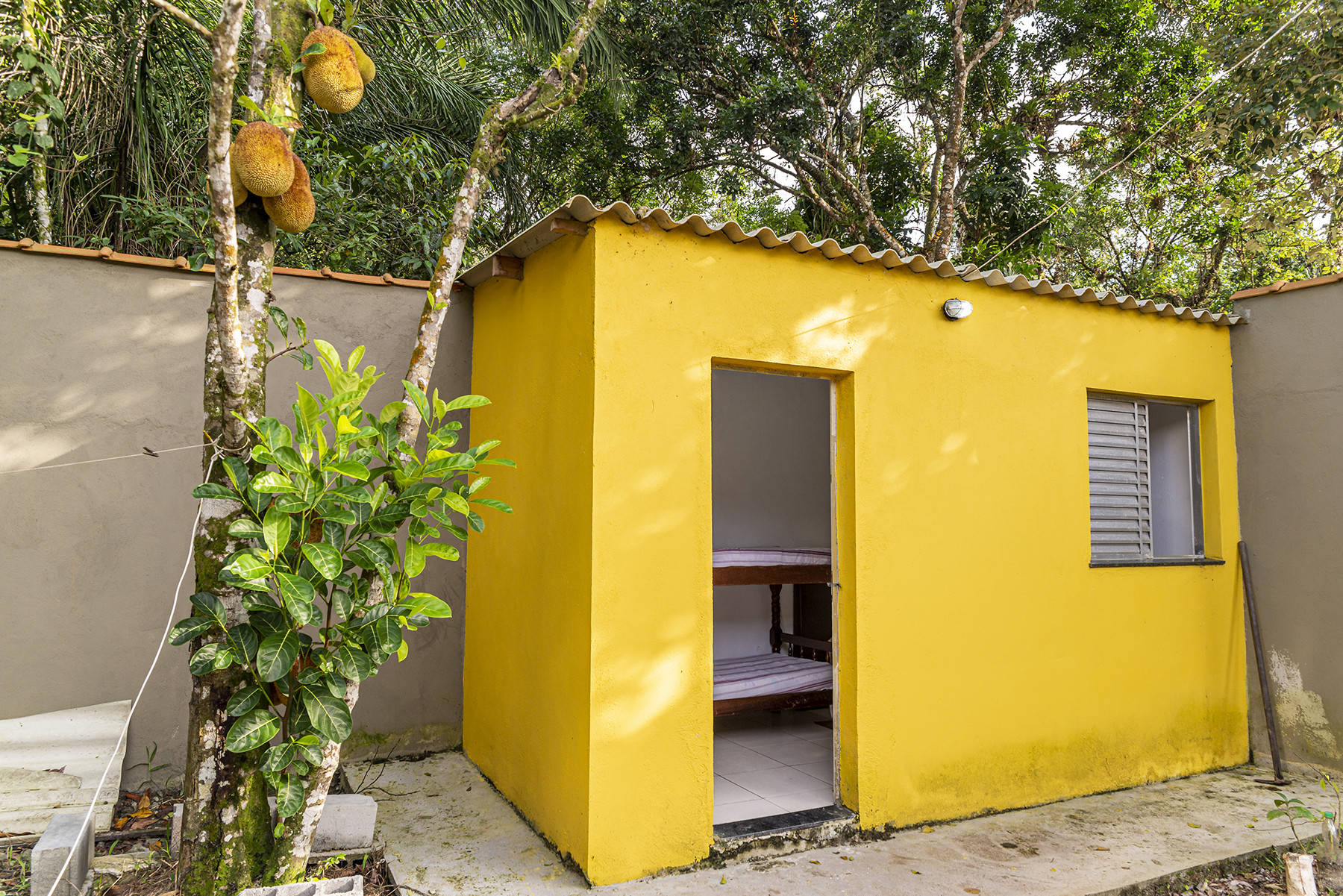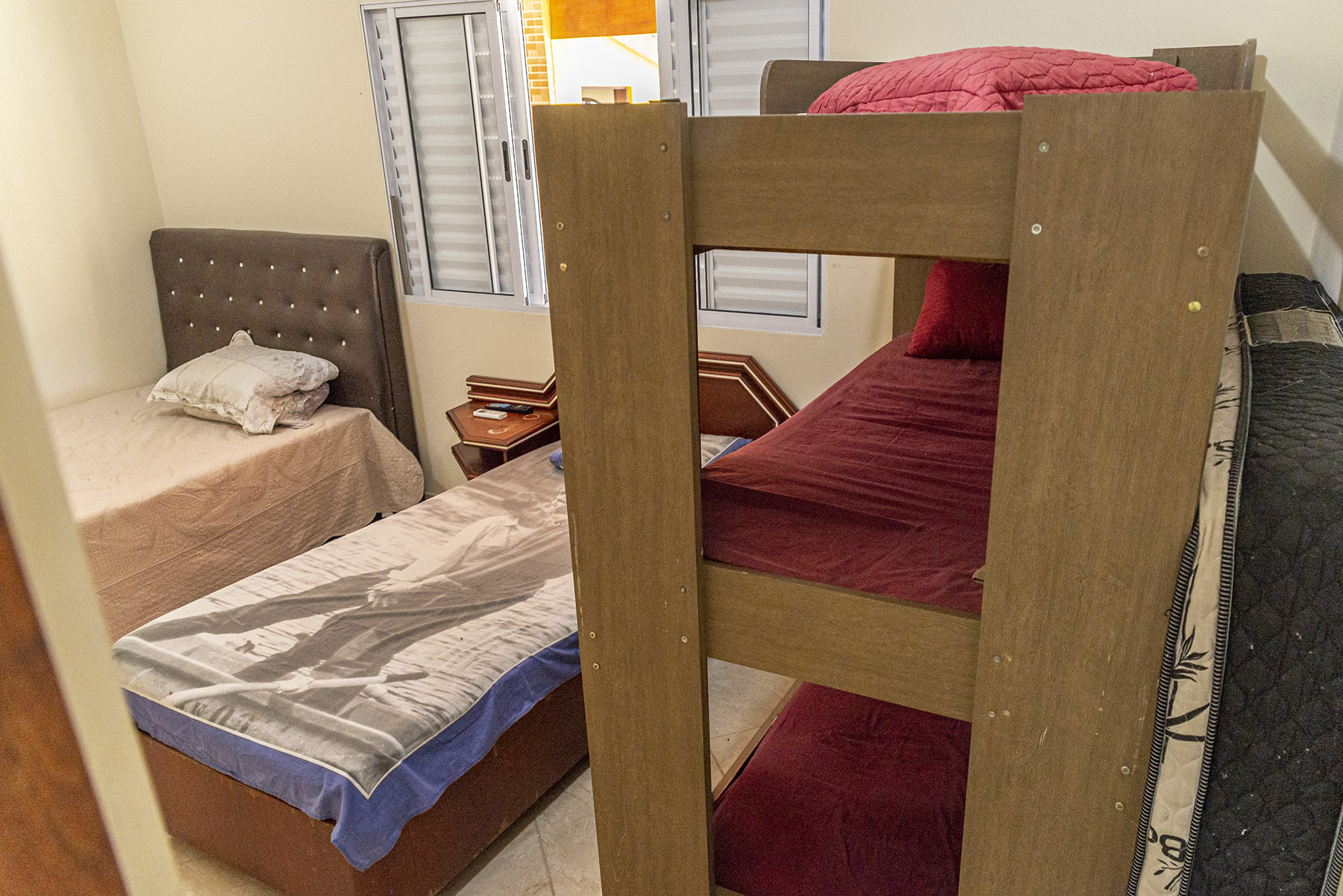 - Suíte 1 há 1 cama de casal, 1 beliche e 1 triliche