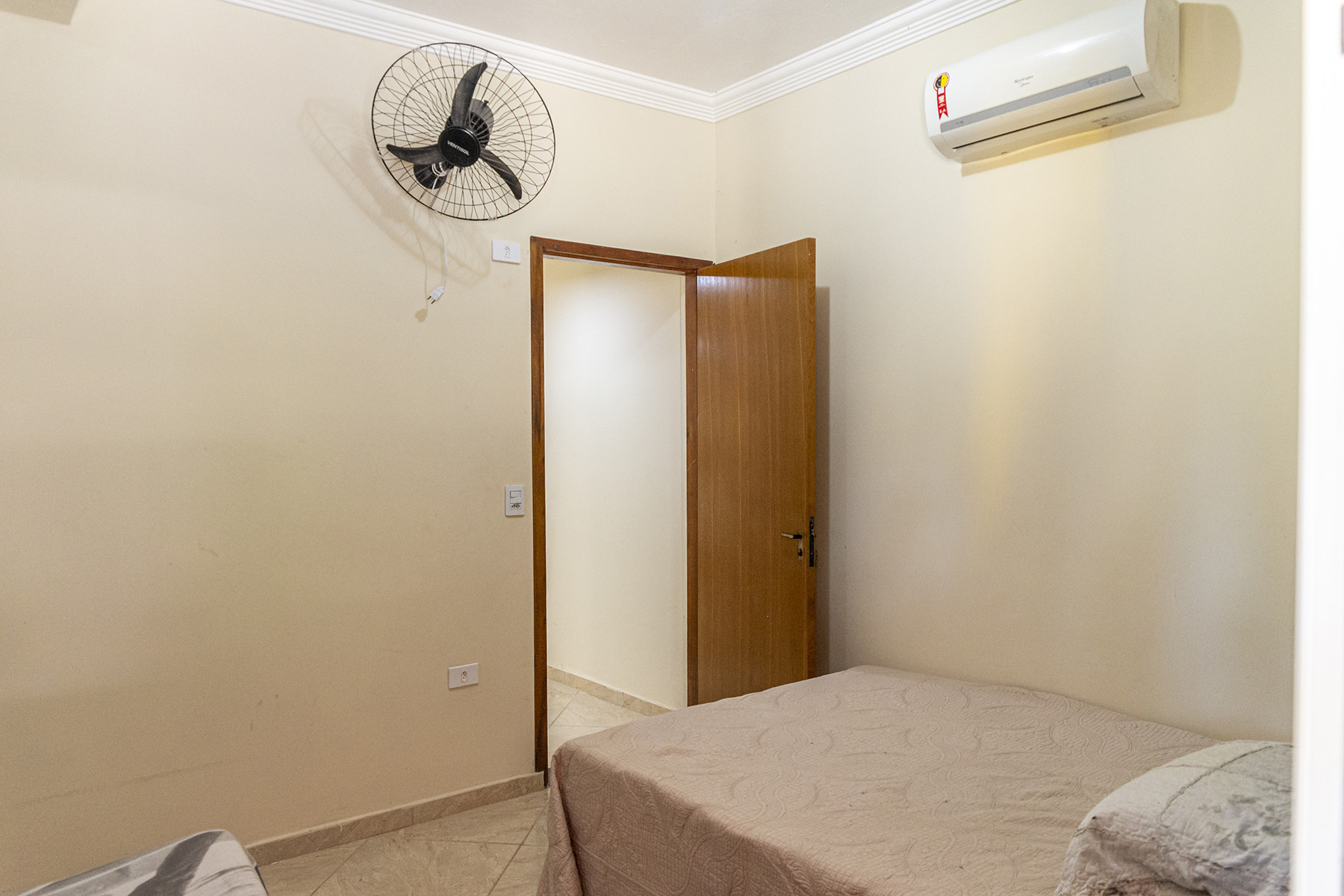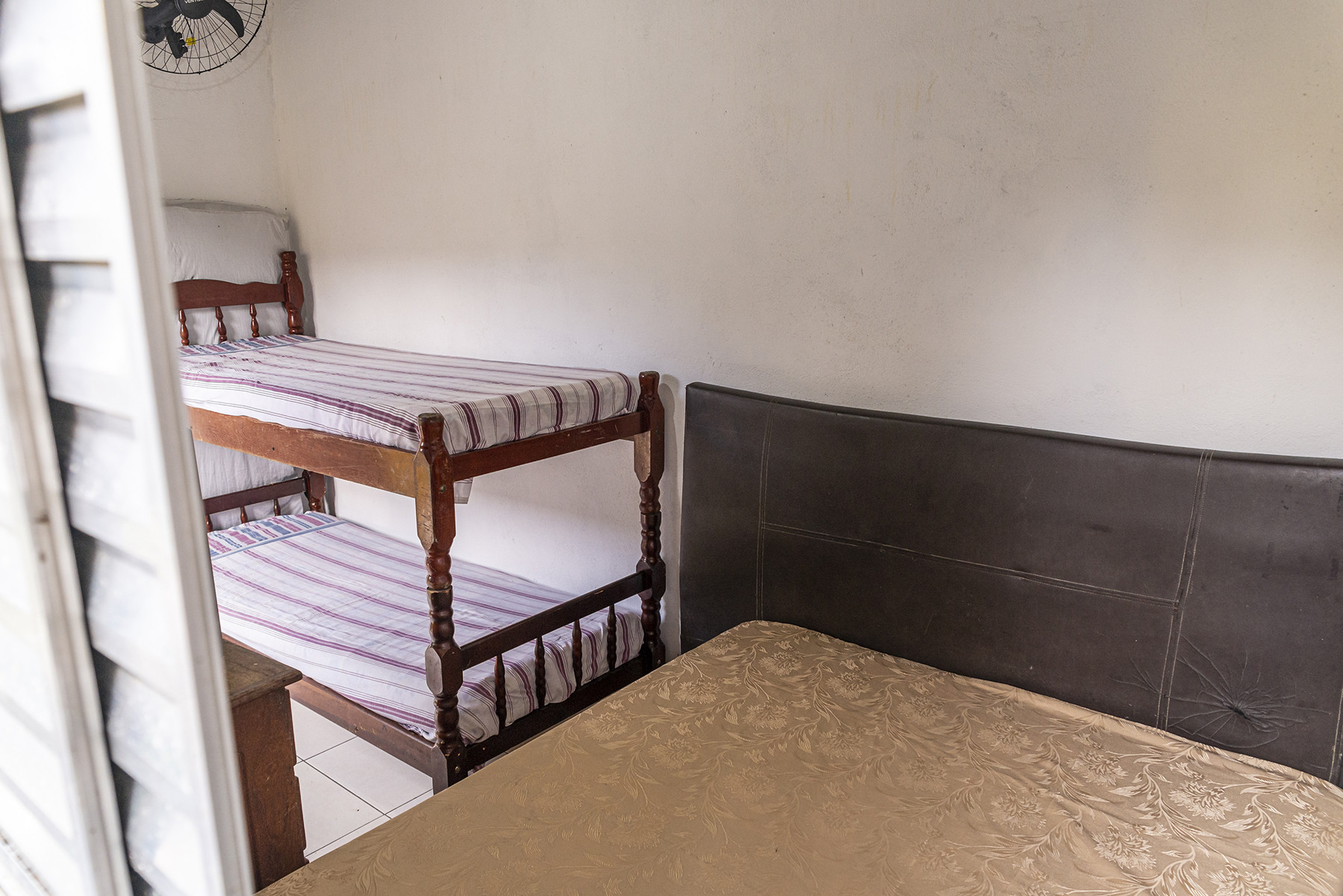 - No quarto 3 há 1 cama de casal, 1 beliche, armário e ventilador de teto