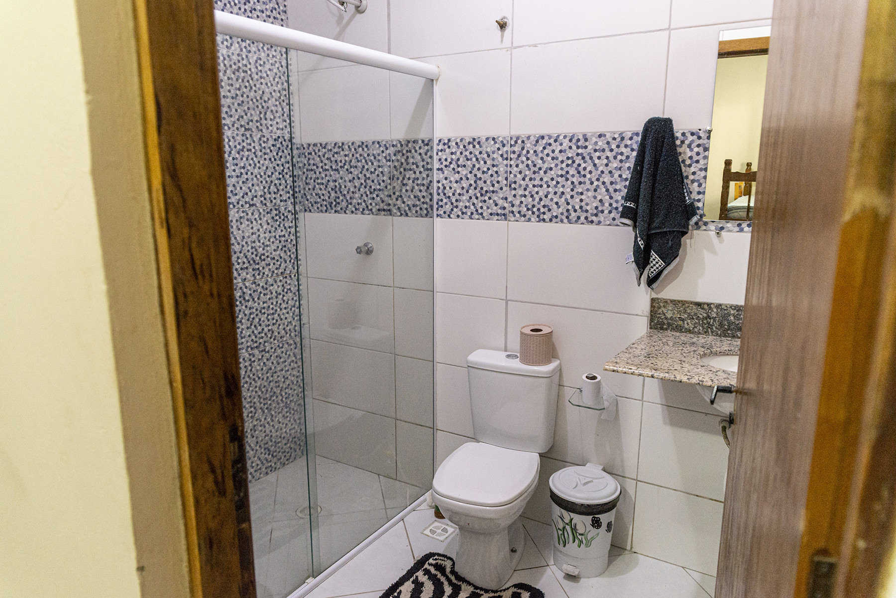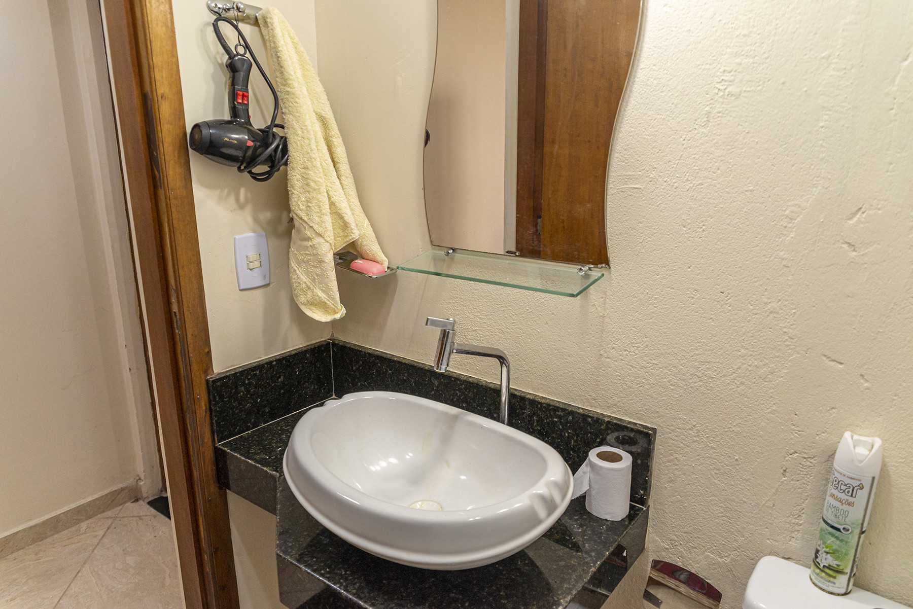 - Banheiros com chuveiro elétrico, box de vidro, espelho e secador de cabelo