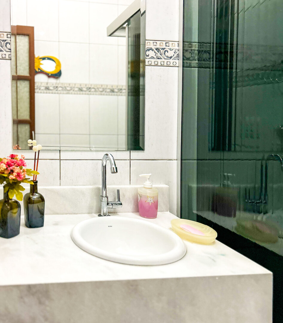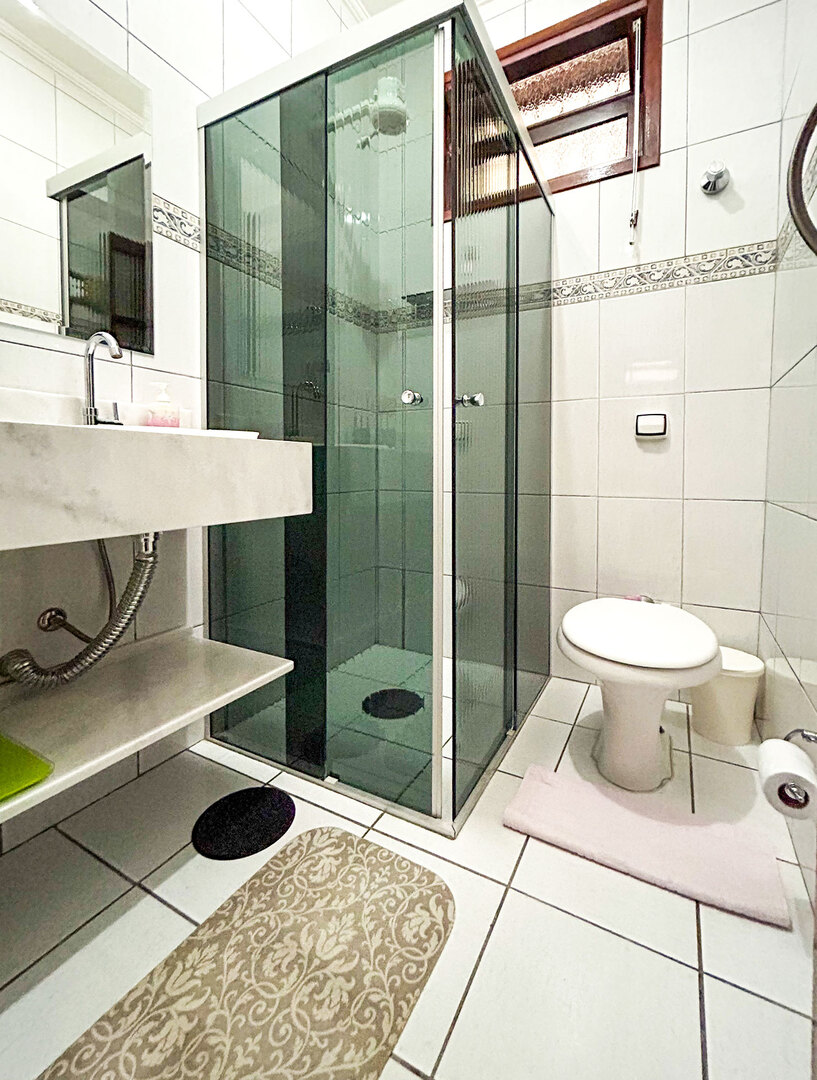 - Os banheiros possuem chuveiro elétrico e box de vidro/acrílico