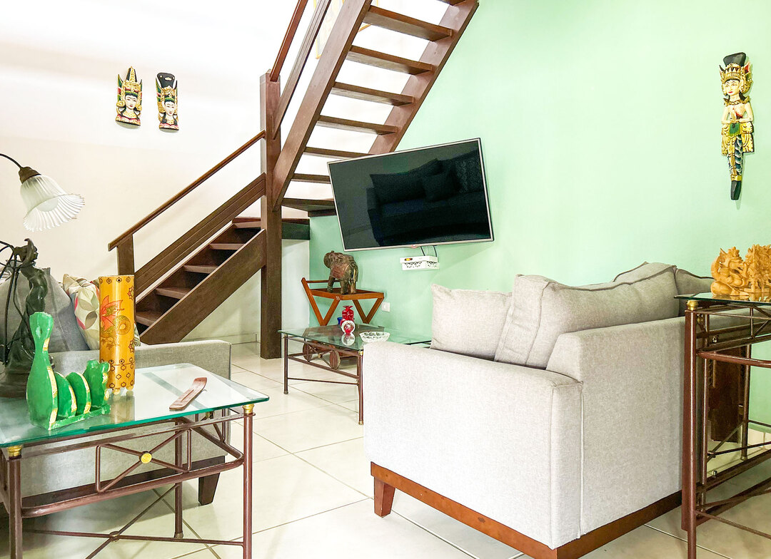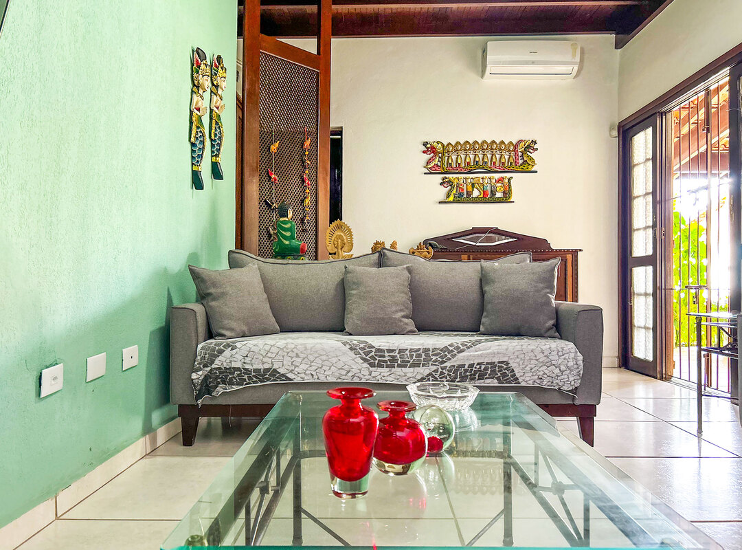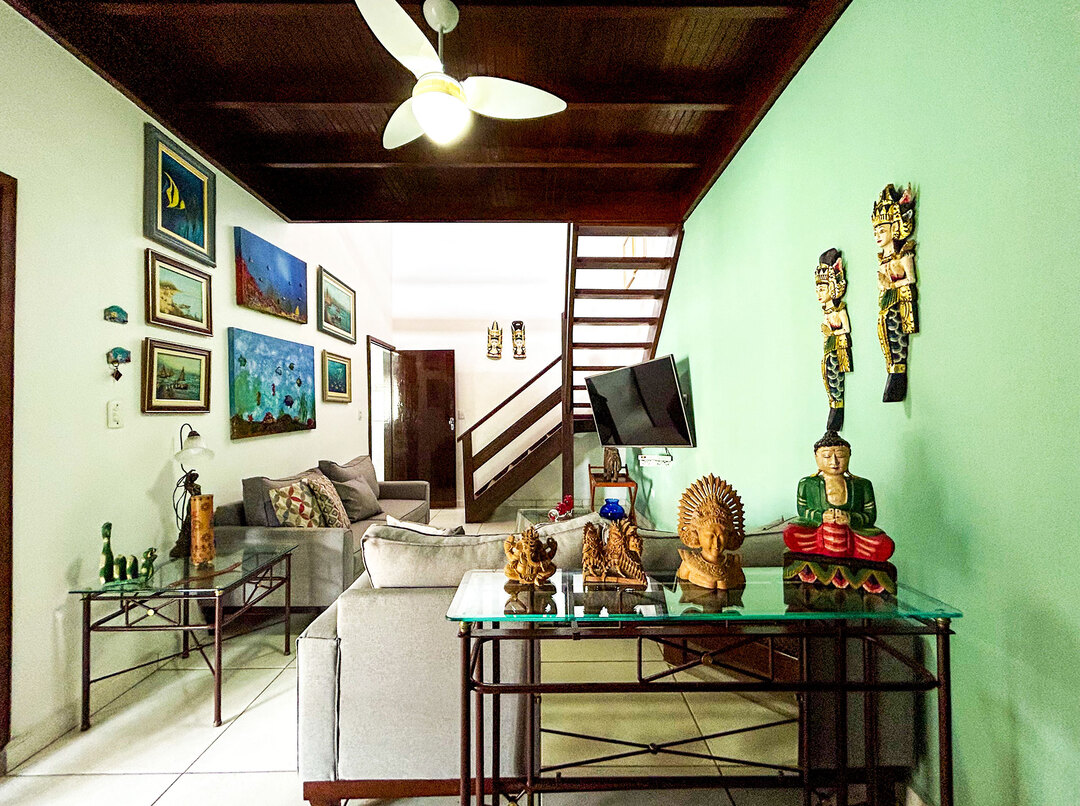 - Na sala você encontra mesa de centro, sofá e ventilador de teto