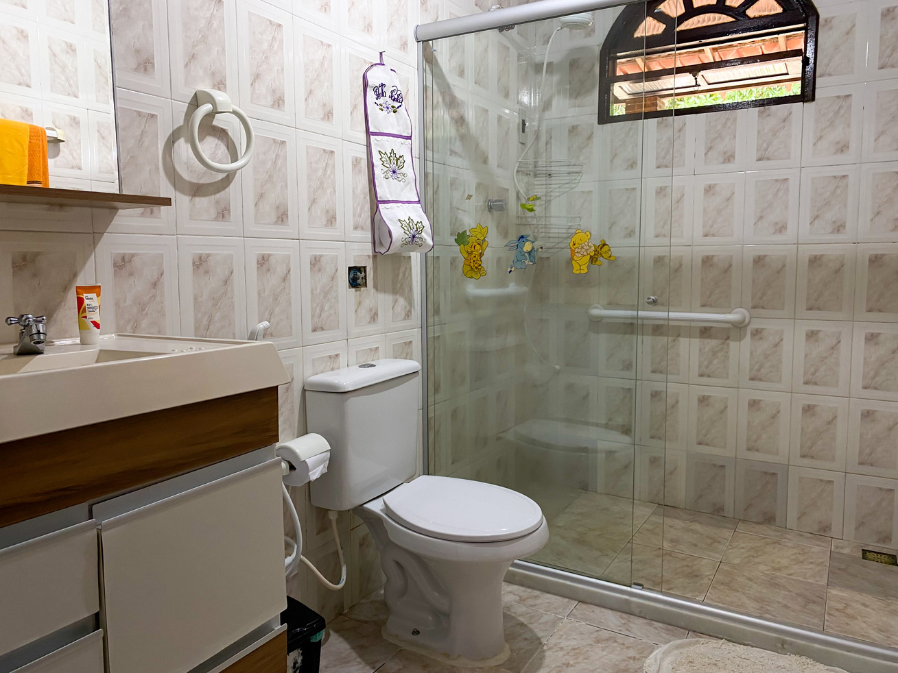 - Os banheiros têm chuveiro elétrico e box de vidro/acrílico