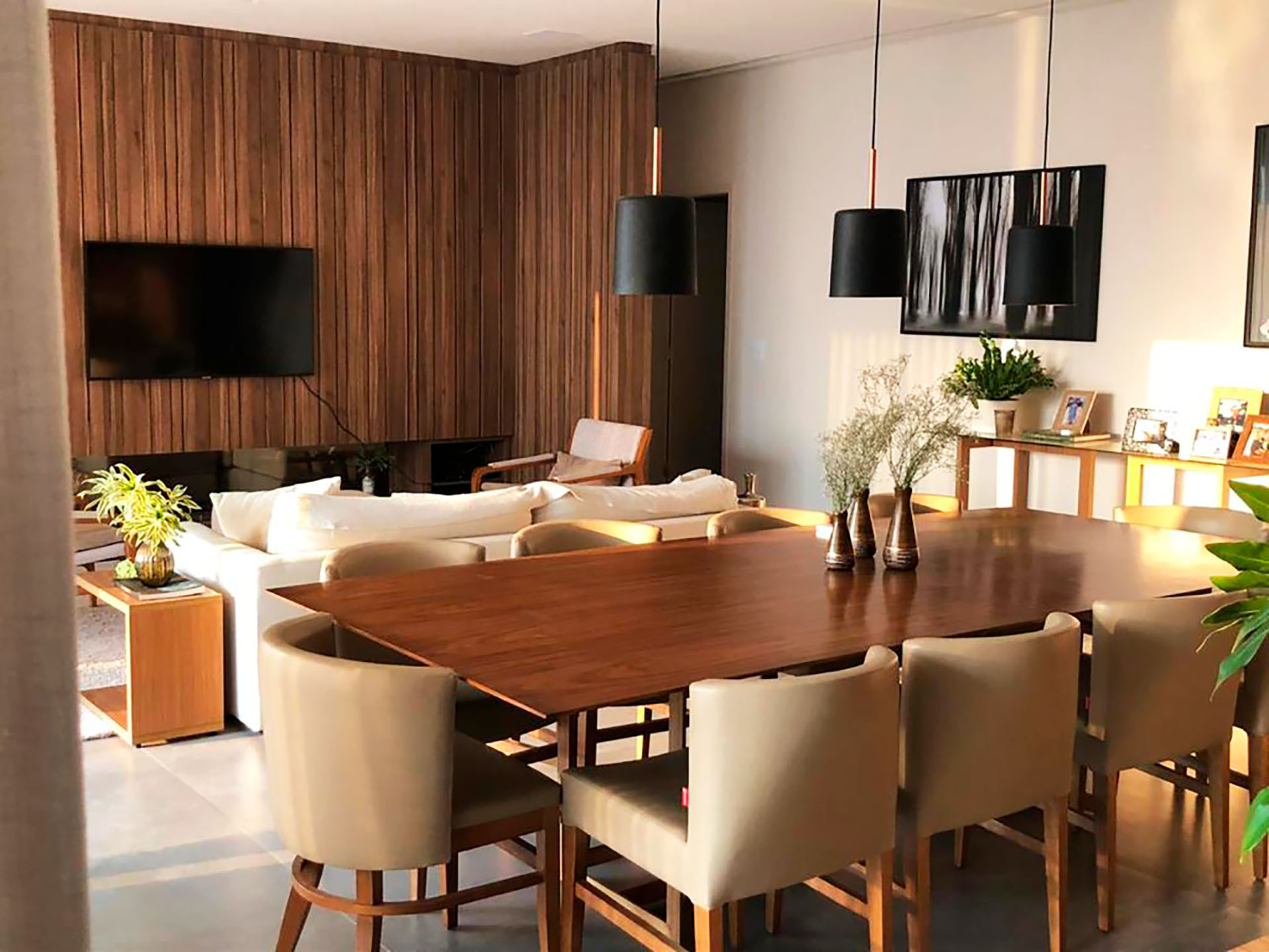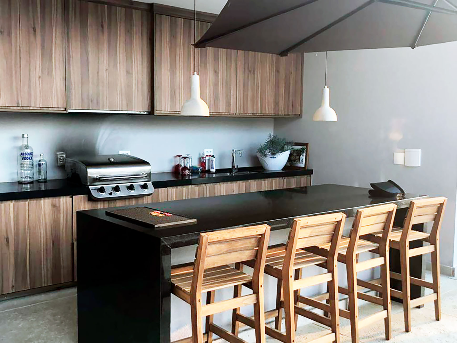 - Área gourmet com churrasqueira, geladeira duplex, fogão, bancada e mesa de jantar com 8 lugares com vista para a piscina