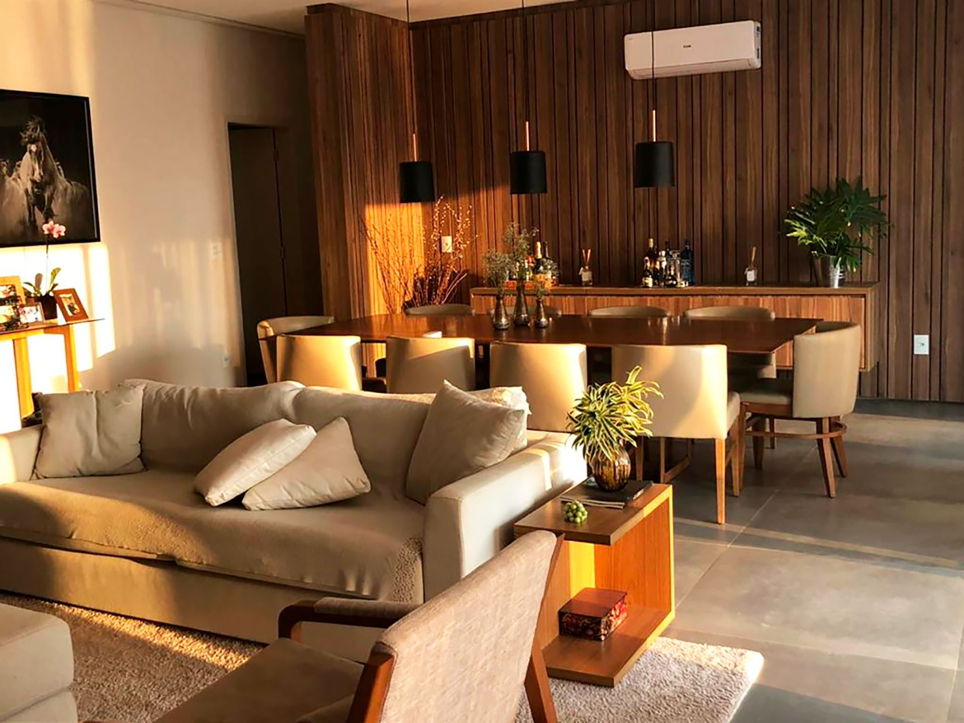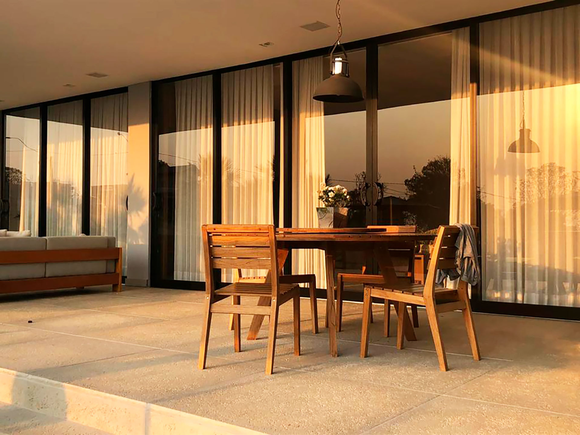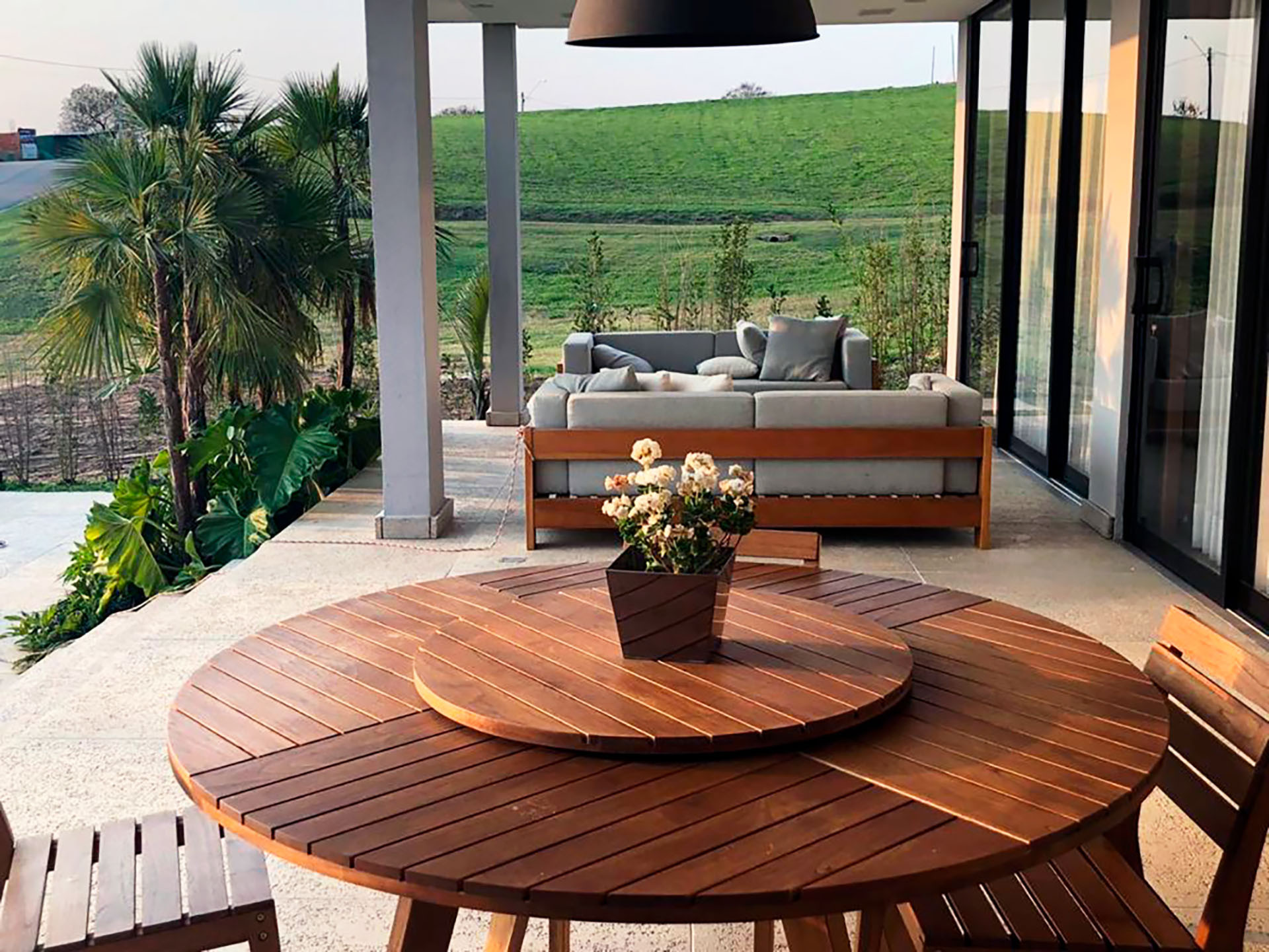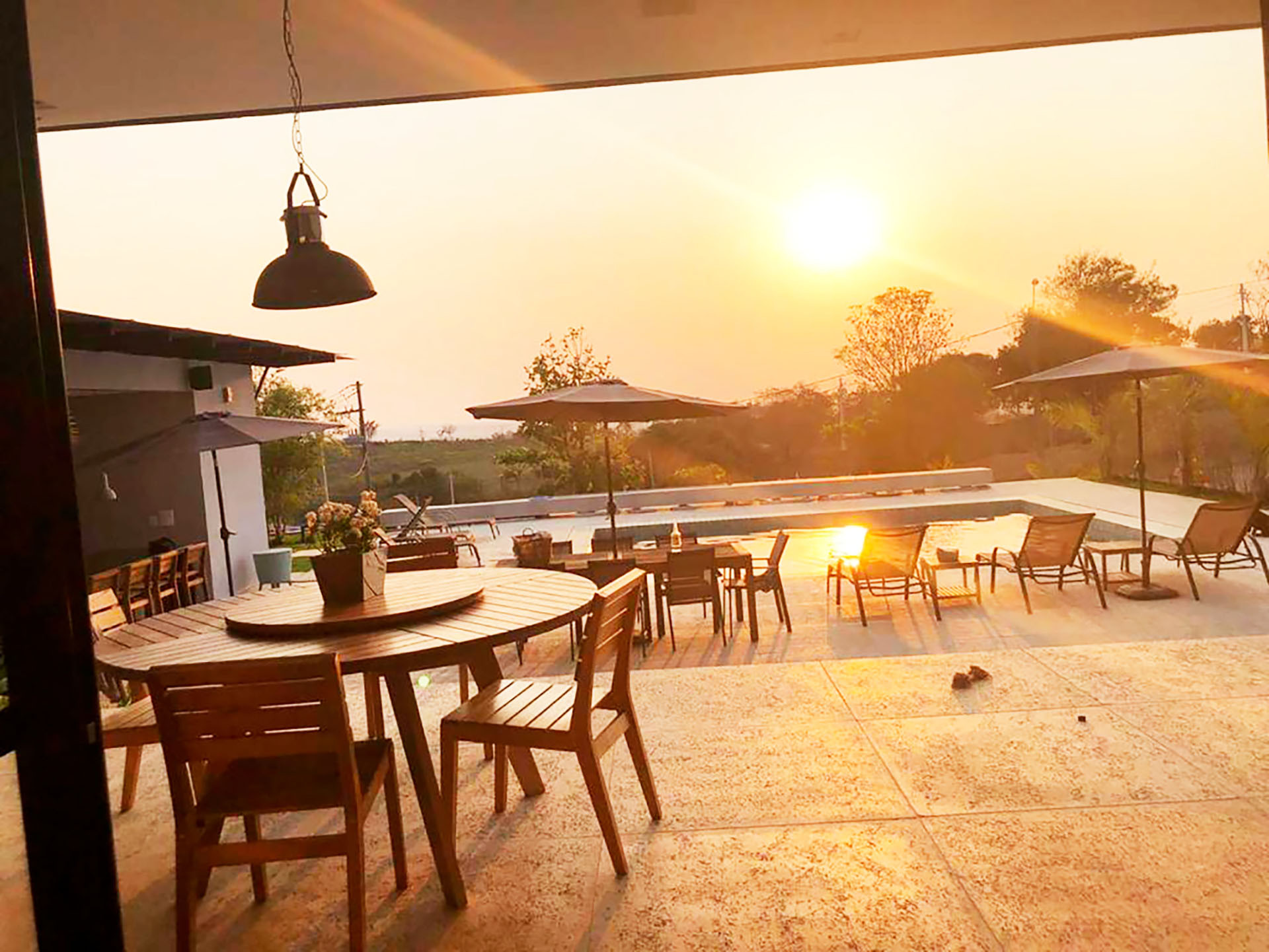 - Varanda coberta com mesa de jantar e sofás aconchegantes, perfeitos para contemplar o entardecer e a piscina