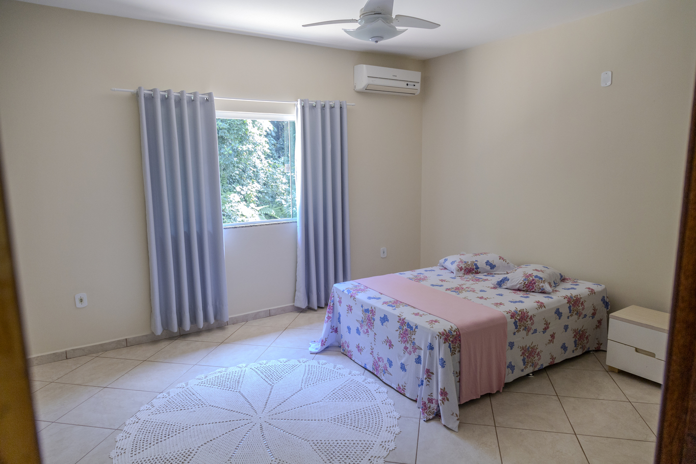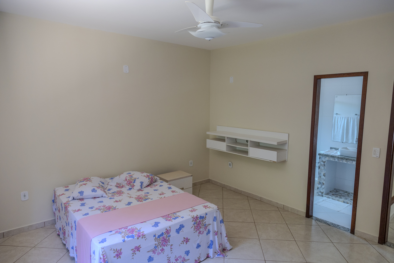 - Na suíte 1 há 1 cama de casal e 1 cama de solteiro, com chuveiro elétrico, box de vidro/acrílico, além de ar-condicionado