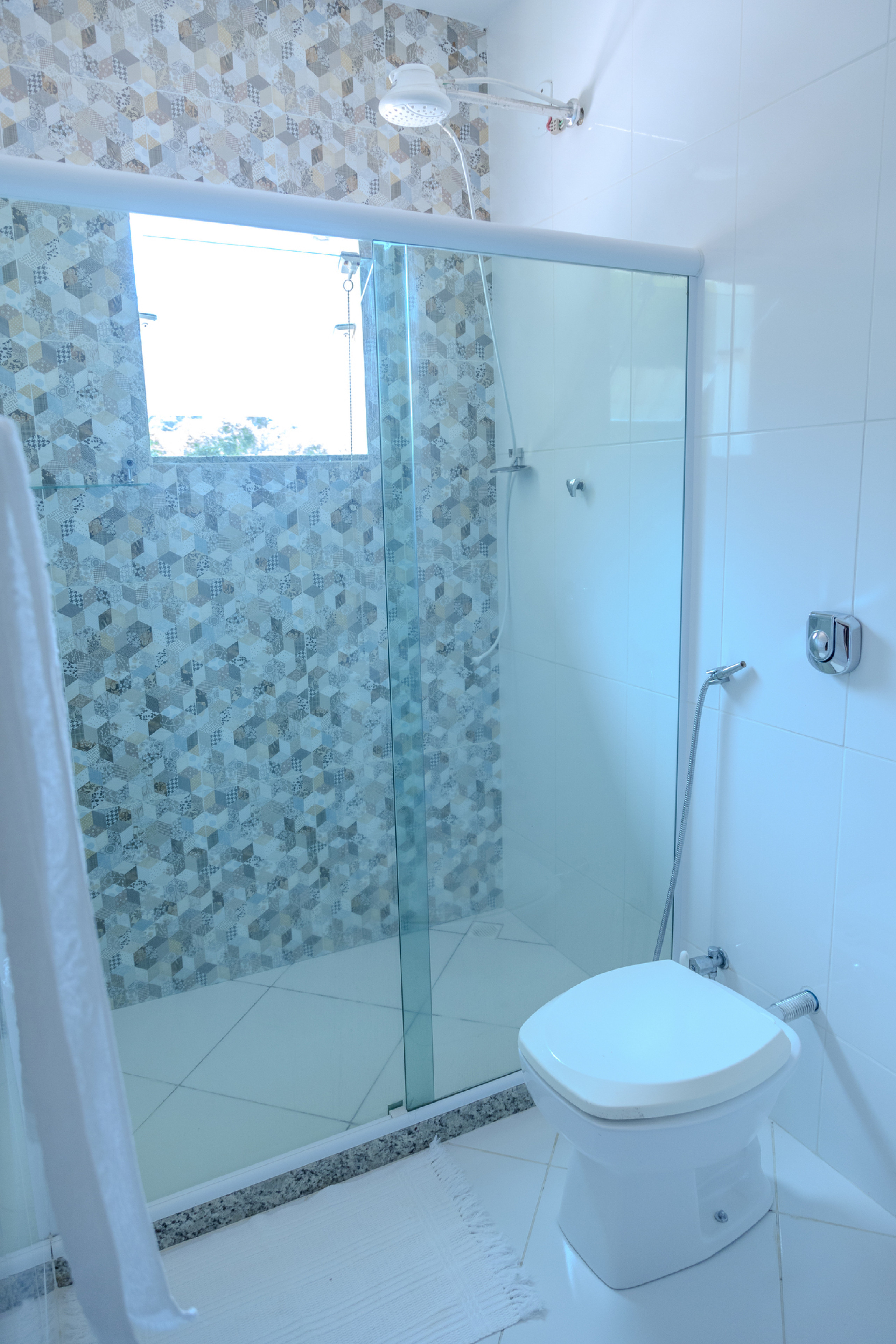 - Os banheiros sociais 1 e 2 são equipados com chuveiro elétrico e box de vidro/acrílico