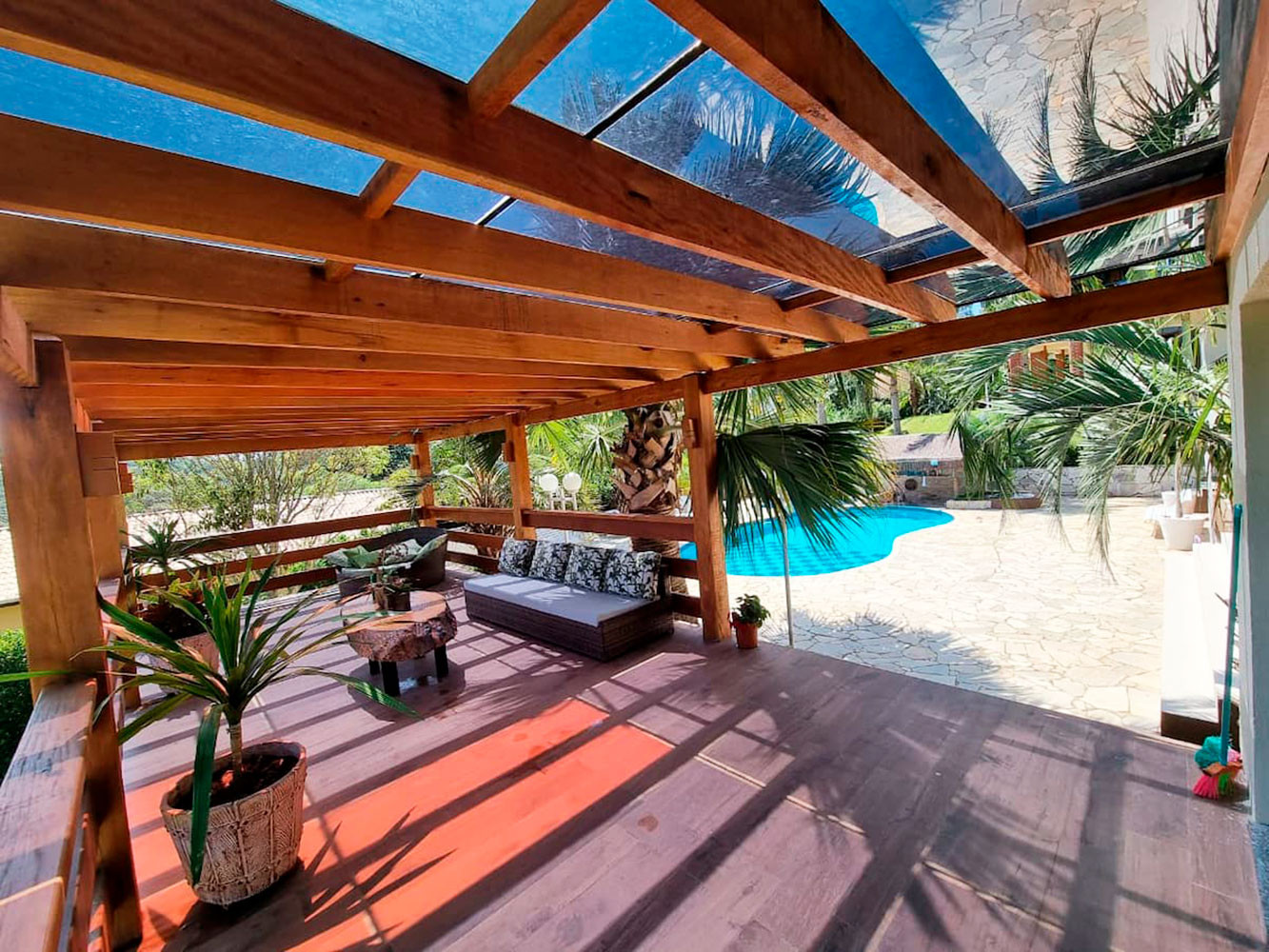 - Cabana externa com sofás aconchegantes e vista privilegiada para a piscina