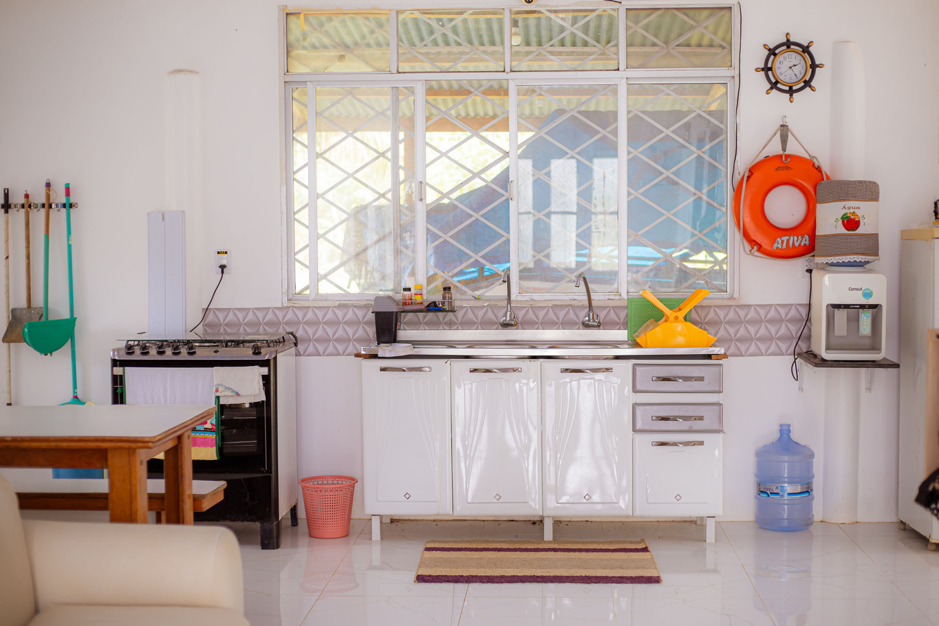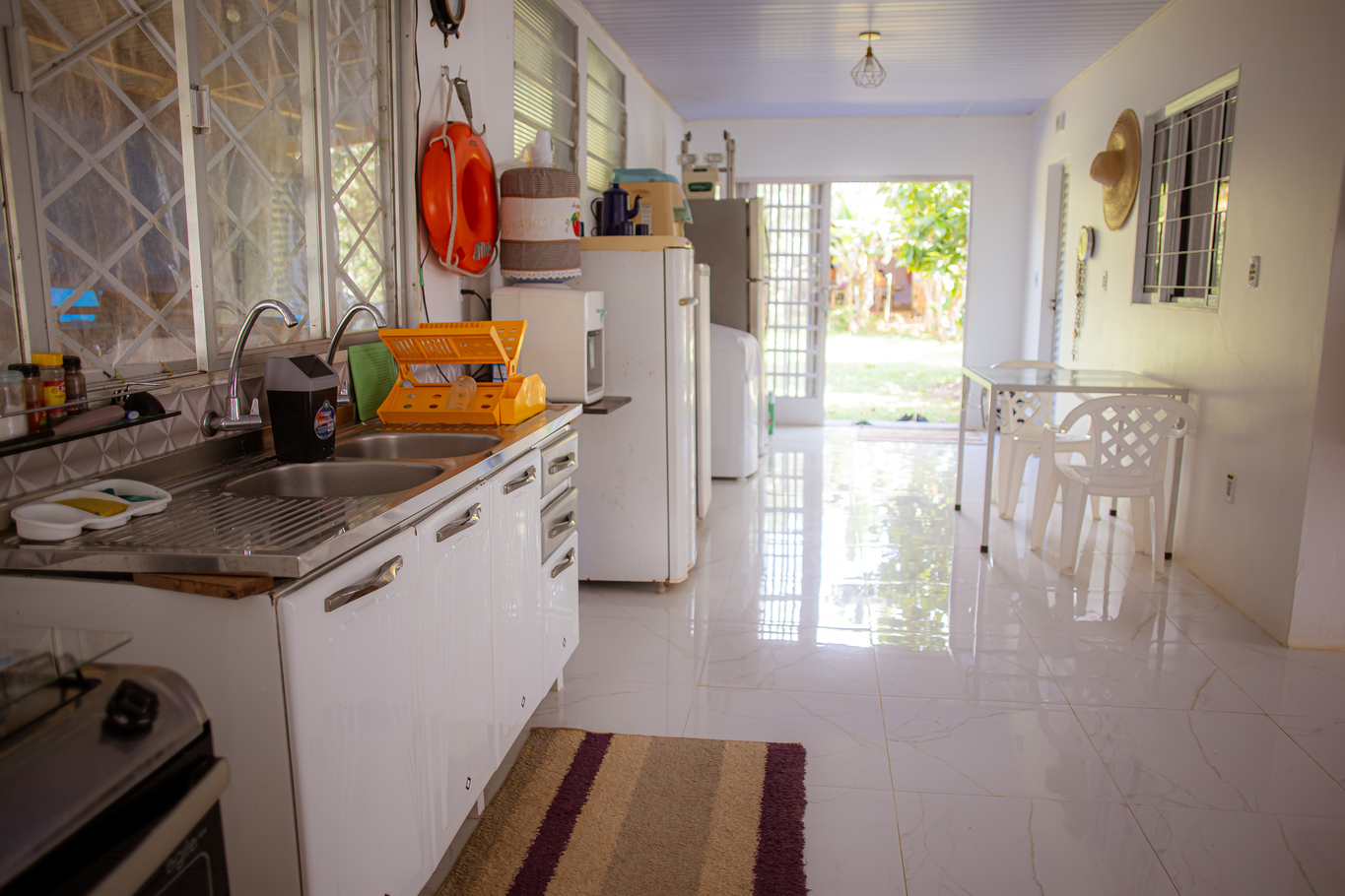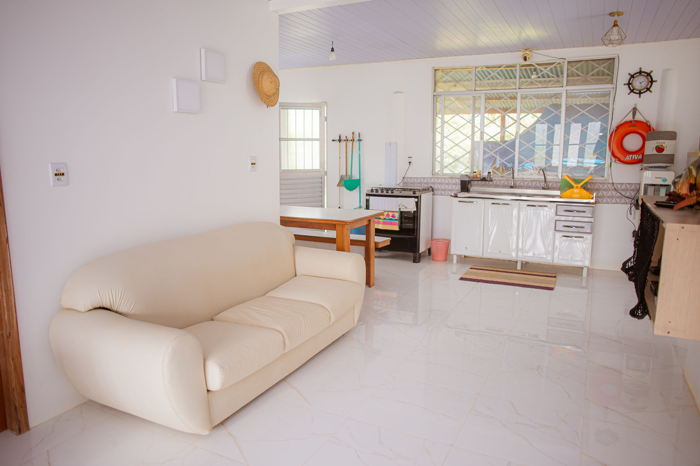 - A cozinha é equipada com diversos utensílios, incluindo cafeteira, freezer, fritadeira, fogão, forno, geladeira, liquidificador e micro-ondas (exceto sal, pimenta e óleo)