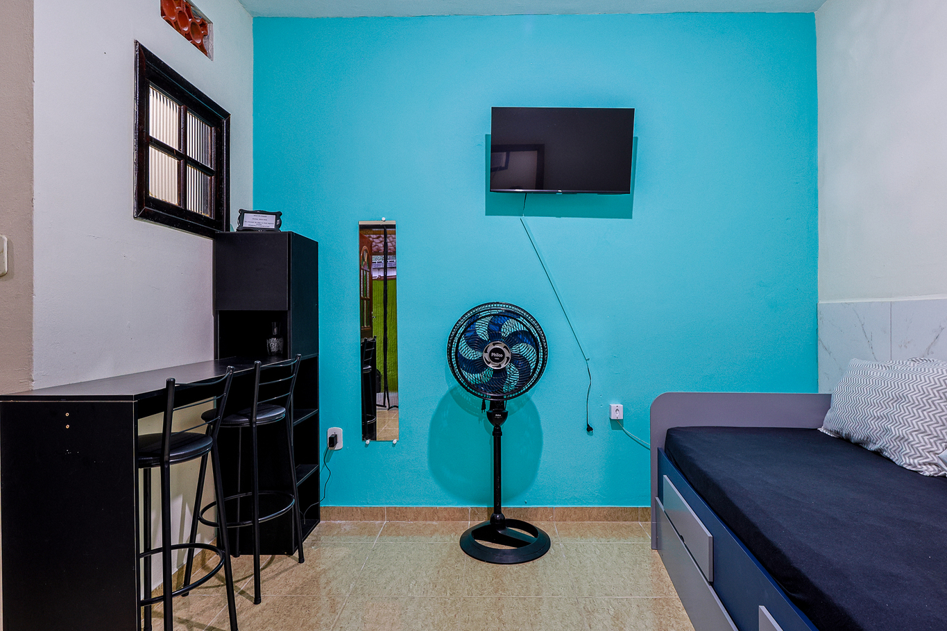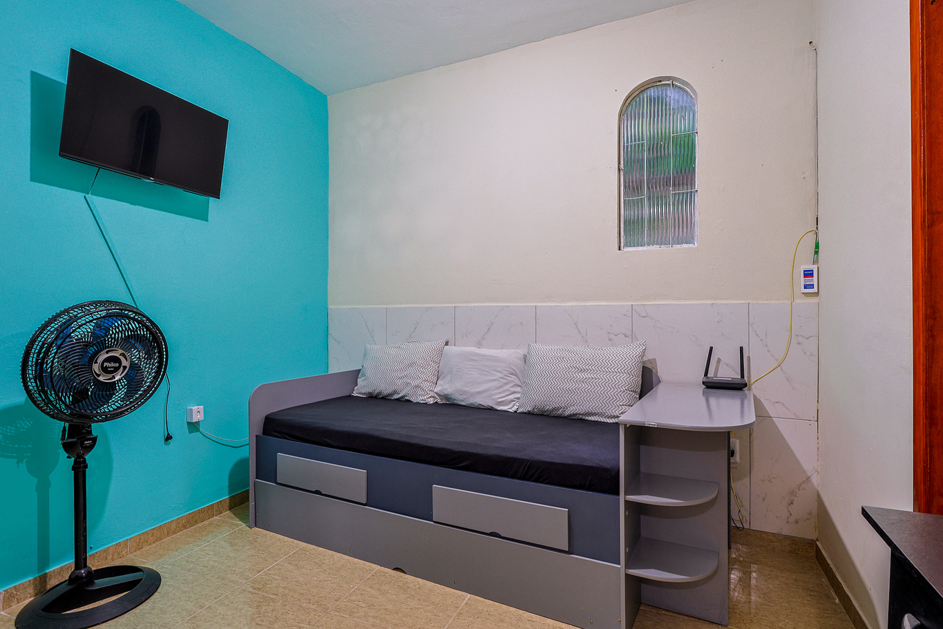 - Sala com sofá-cama, smart TV e ventilador de parede para conforto extra