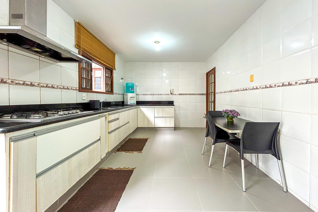 - Altamente equipada, a cozinha possui diversos utensílios necessários para preparar deliciosos pratos, incluindo fogão, geladeira, armário, mesa, balcão e exaustor