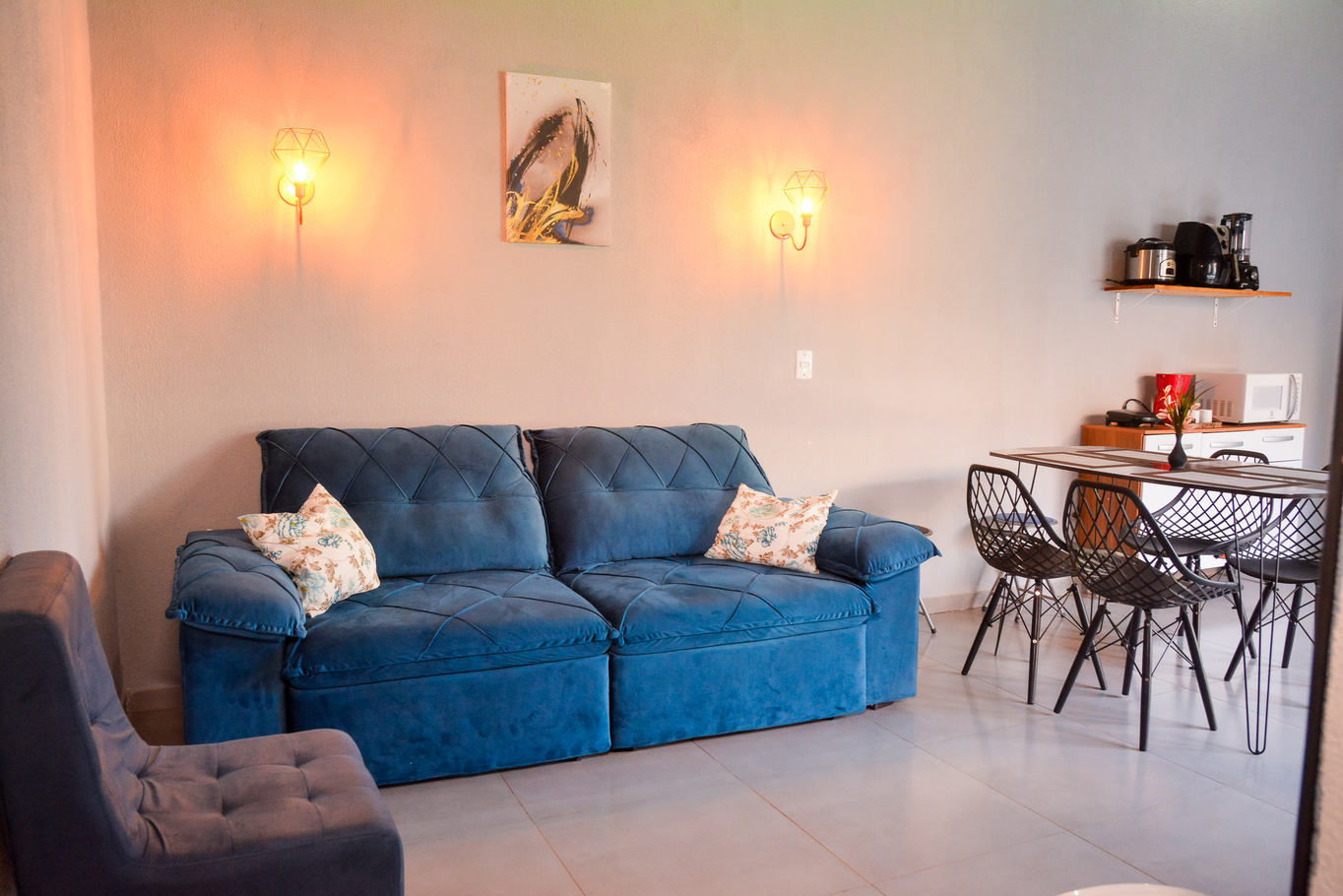 - Sala com sofá, sofá-cama, mesa de jantar e TV