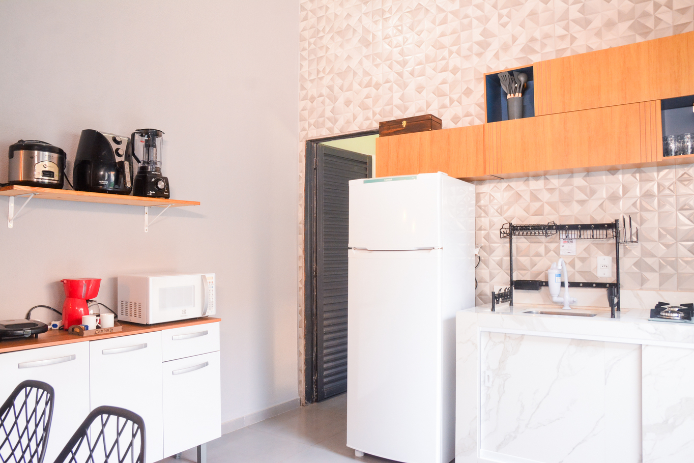 - Cozinha equipada com geladeira, microondas, cafeteira, torradeira, fritadeira, liquidificador, pratos, copos, talheres, panelas, taças, tábuas, potes, xícaras e lixeira