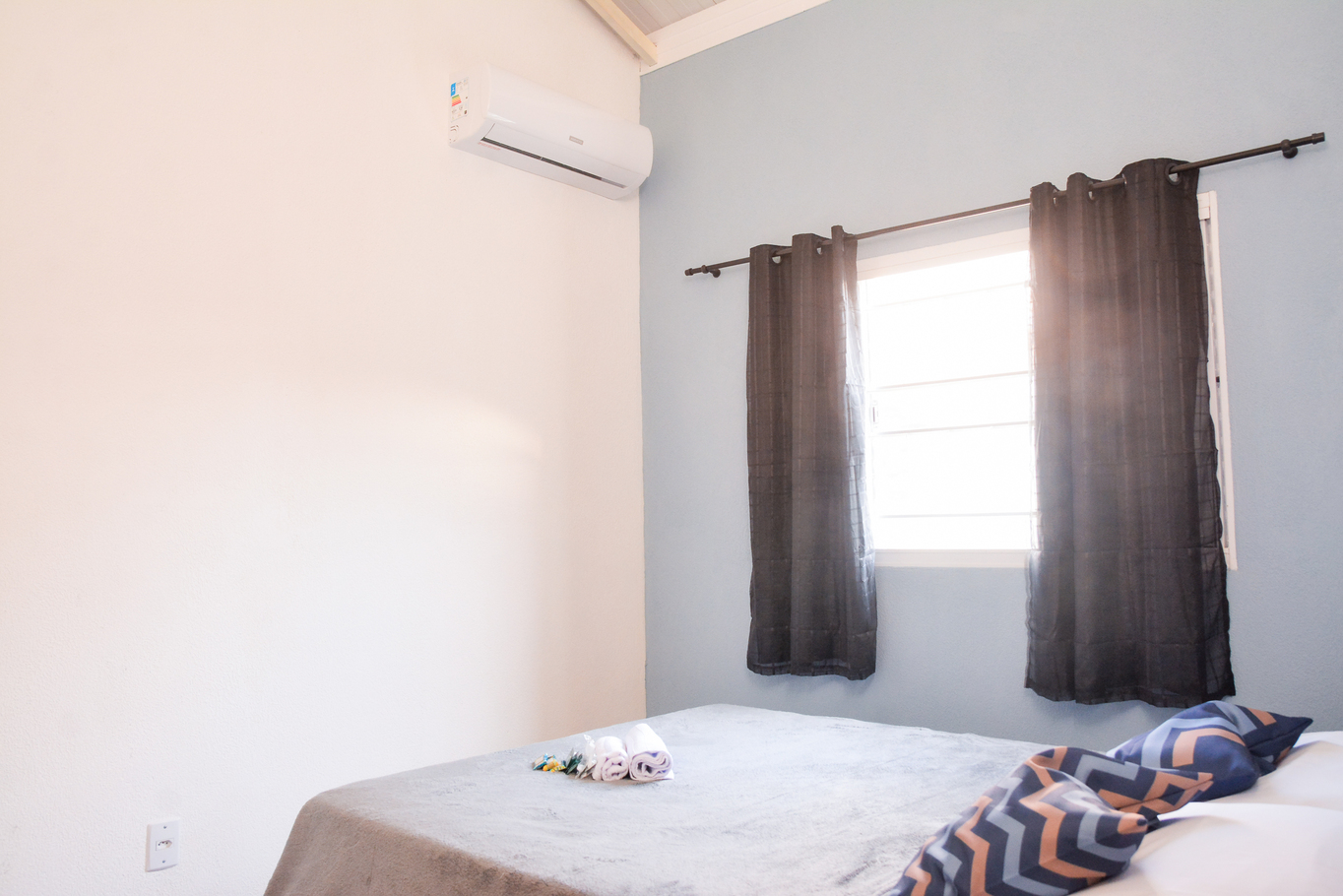 - Quarto 1 (Suíte): cama de casal, armário, ar-condicionado e banheiro com chuveiro elétrico e secador