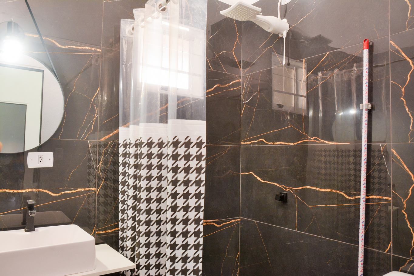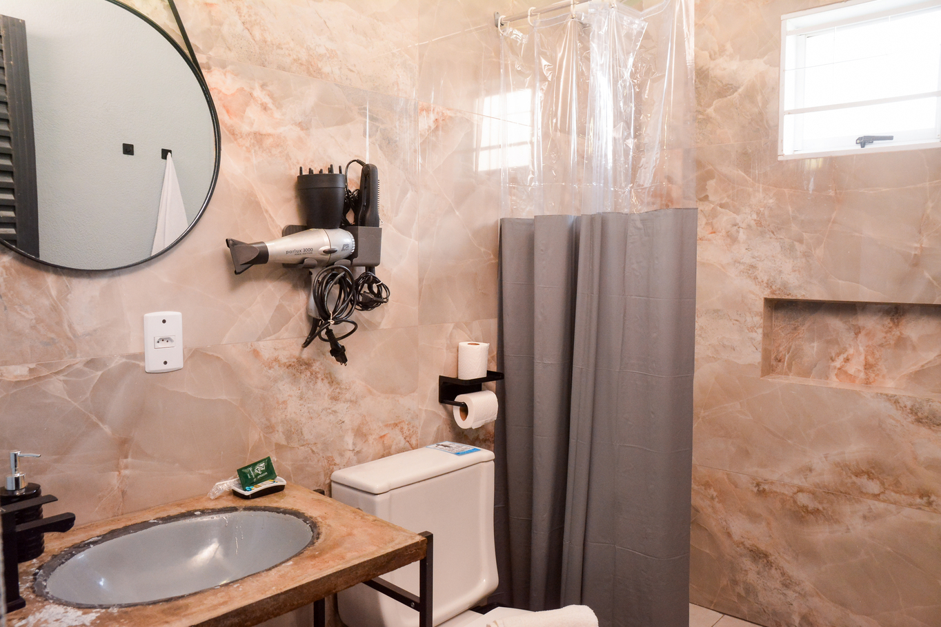 - Banheiro social com chuveiro elétrico e secador