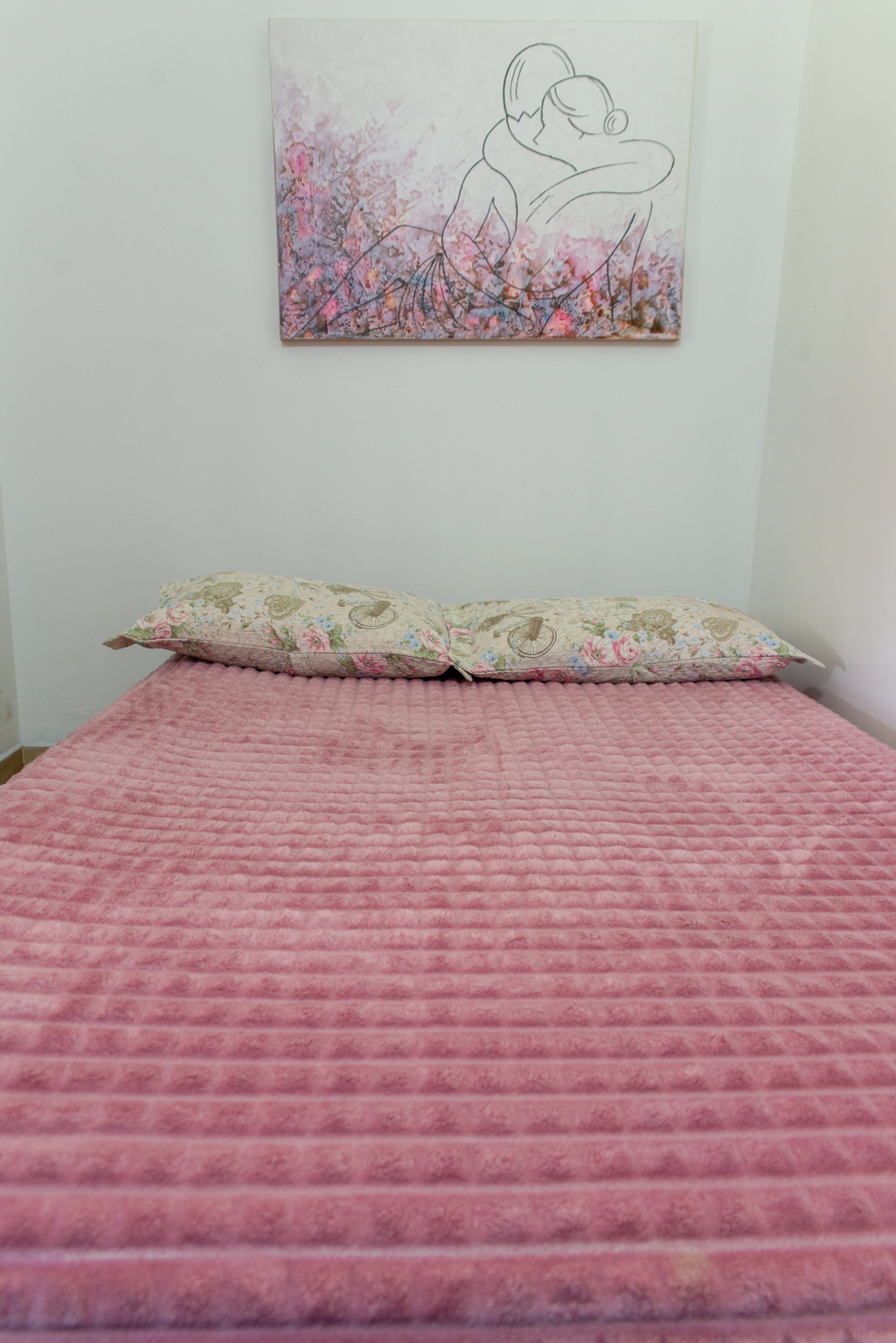 - Quarto 1 (suíte): cama de casal, armário, ventilador de teto, edredom e banheiro privativo com box de vidro
