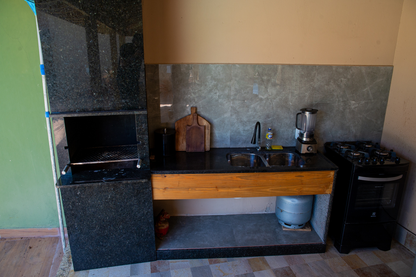 - Área gourmet com churrasqueira, geladeira, mesa de refeições, poltronas e smart tv