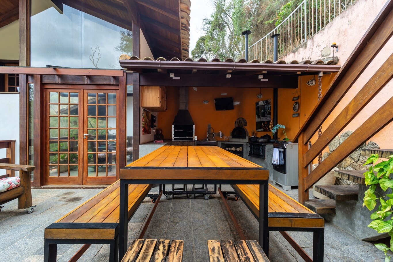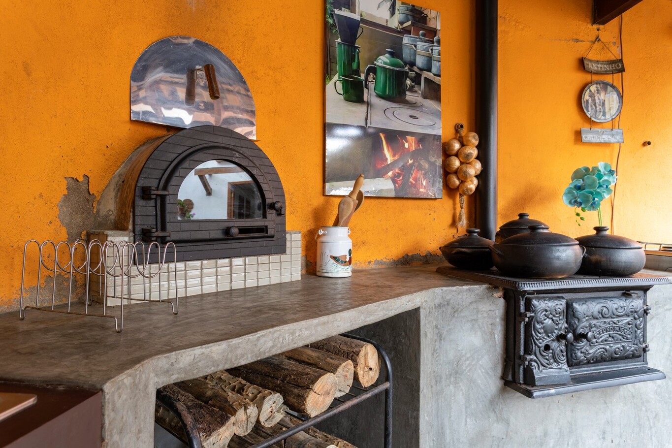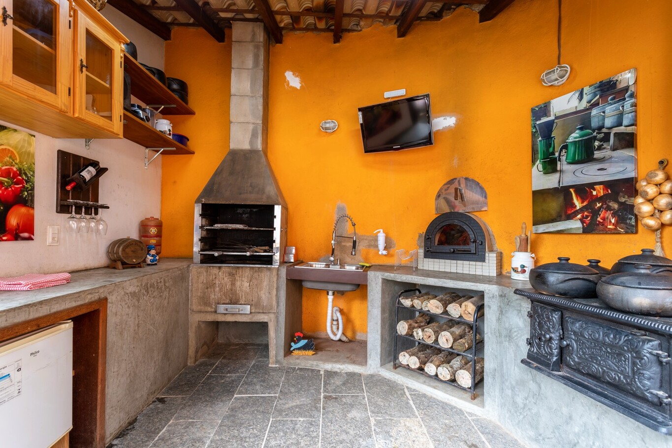 - Área gourmet com churrasqueira, forno e fogão a lenha, fogão a gás, panelas de barro, mesa de refeições, bebedouro, TV e lavatório específico