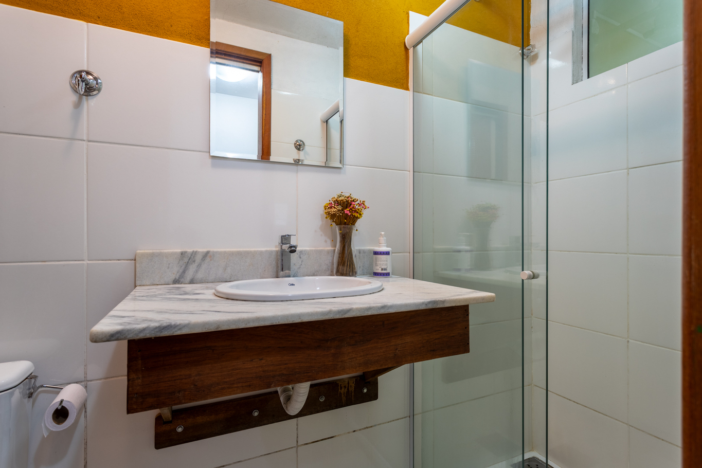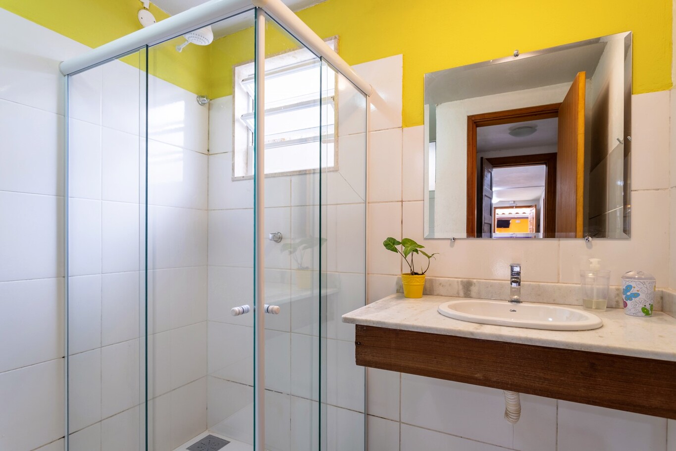 - Banheiro social com chuveiro elétrico, box de vidro e itens de banho