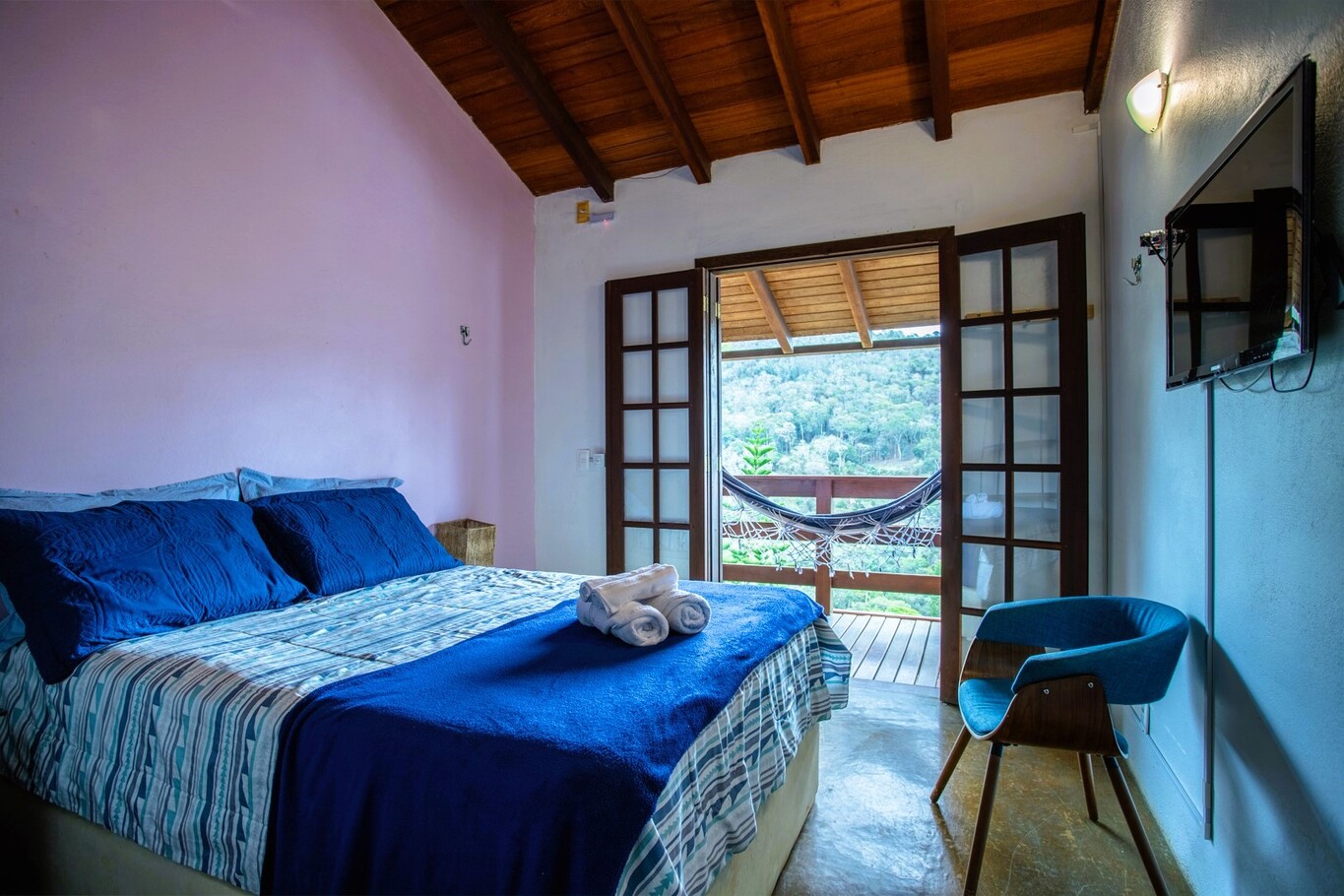 - Quarto 1 (suíte): 1 cama de casal, armário, tv, ventilador de teto, edredom/cobertor, protetor de colchão, banheiro privativo com chuveiro elétrico e box, e varanda com rede e iluminação privativa. Quarto versátil tornando-se uma suíte ou não, conforme a necessidade dos hóspedes