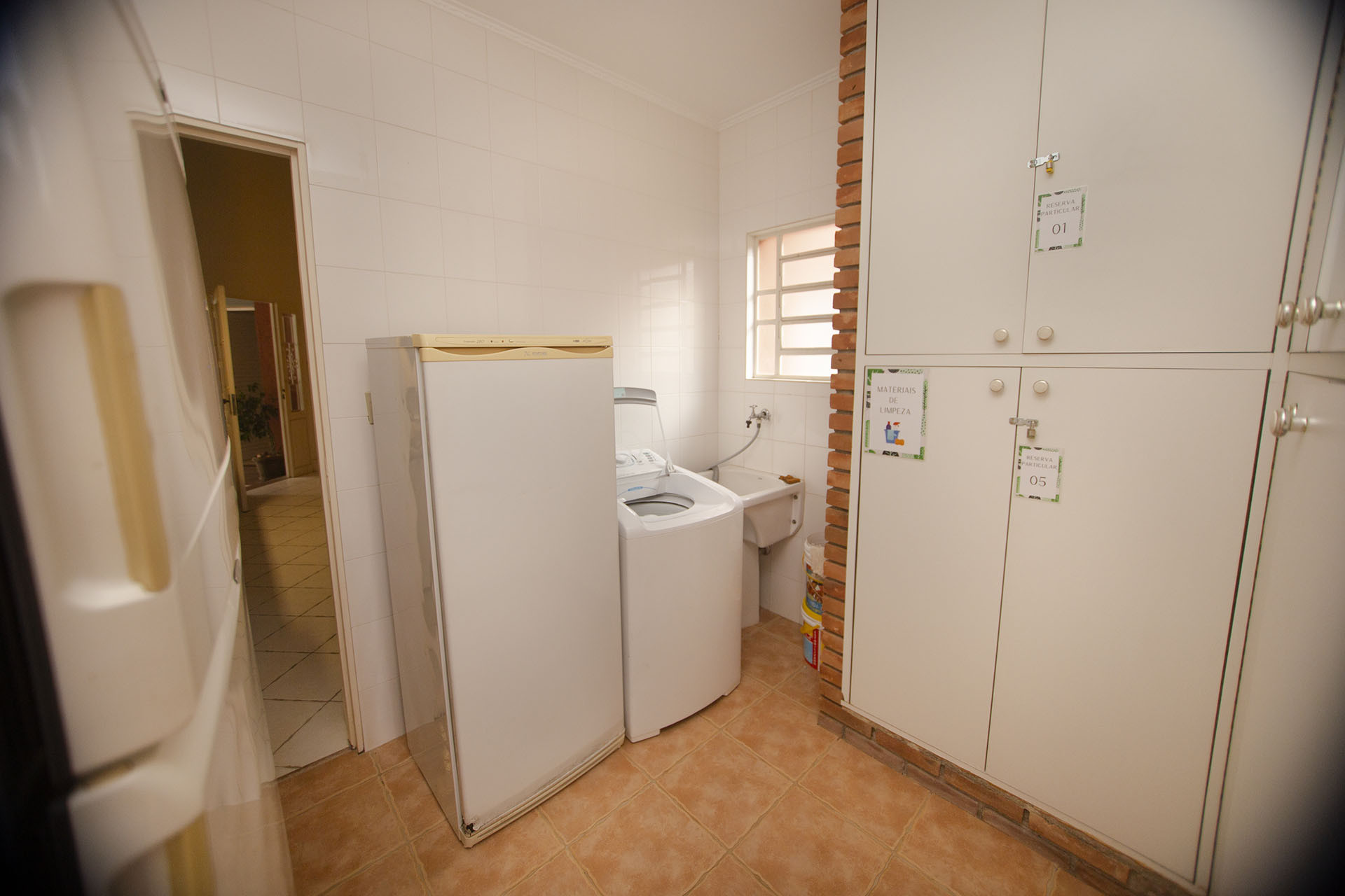 - Lavanderia com máquina de lavar, tanque, varal, ferro e tábua de passar roupa