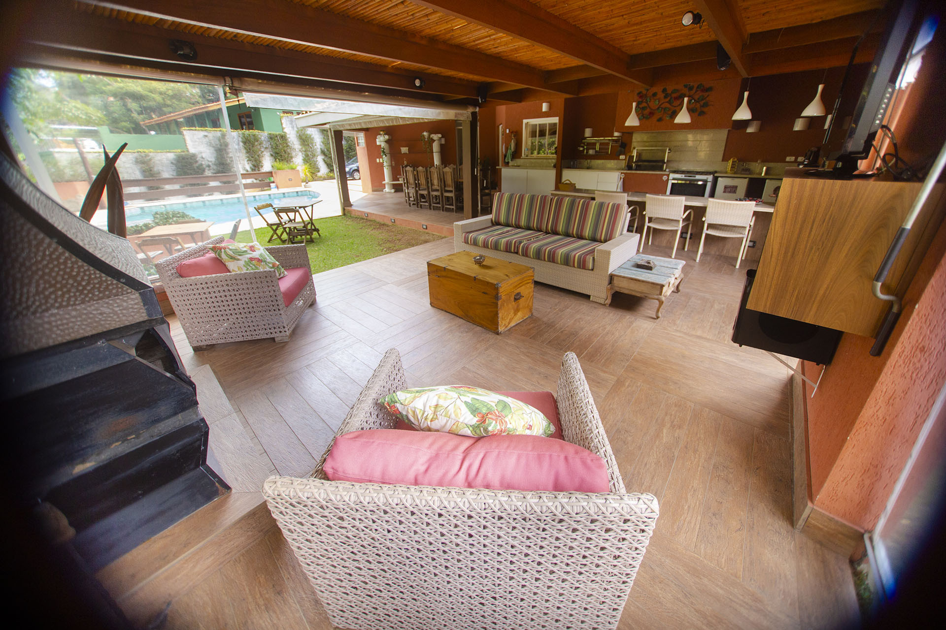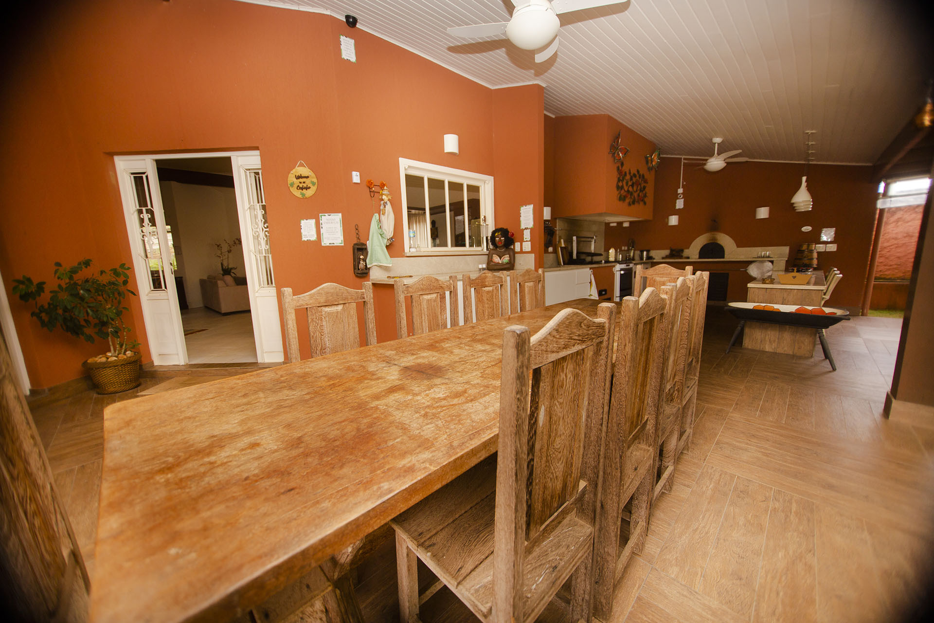 - Área gourmet externa com churrasqueira, forno a lenha, 2 frigobar, mesa de jantar e balcão com banquetas