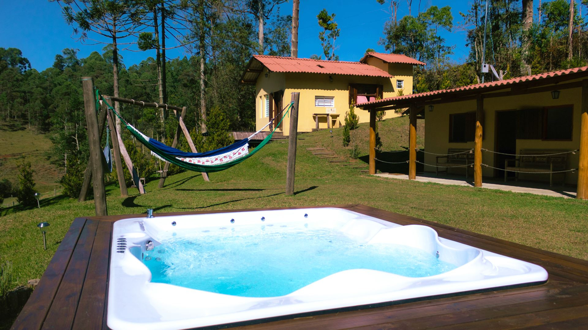 Venha se hospedar em uma incrível casa de campo em Piranguçu/MG a apenas 16,7 km do centro turístico de Campos do Jordão (Vila Capivari), com ampla área de lazer, área gourmet completa, espreguiçadeiras, hidromassagem, quadra esportiva, redes de descanso e terraço coberto, onde você poderá desfrutar das belezas naturais, fazer cavalgadas, explorar trilhas e cachoeiras. O imóvel se divide em 2 chalés e oferece 3 suítes e 1 quarto para sua comodidade. Reserve já sua hospedagem!