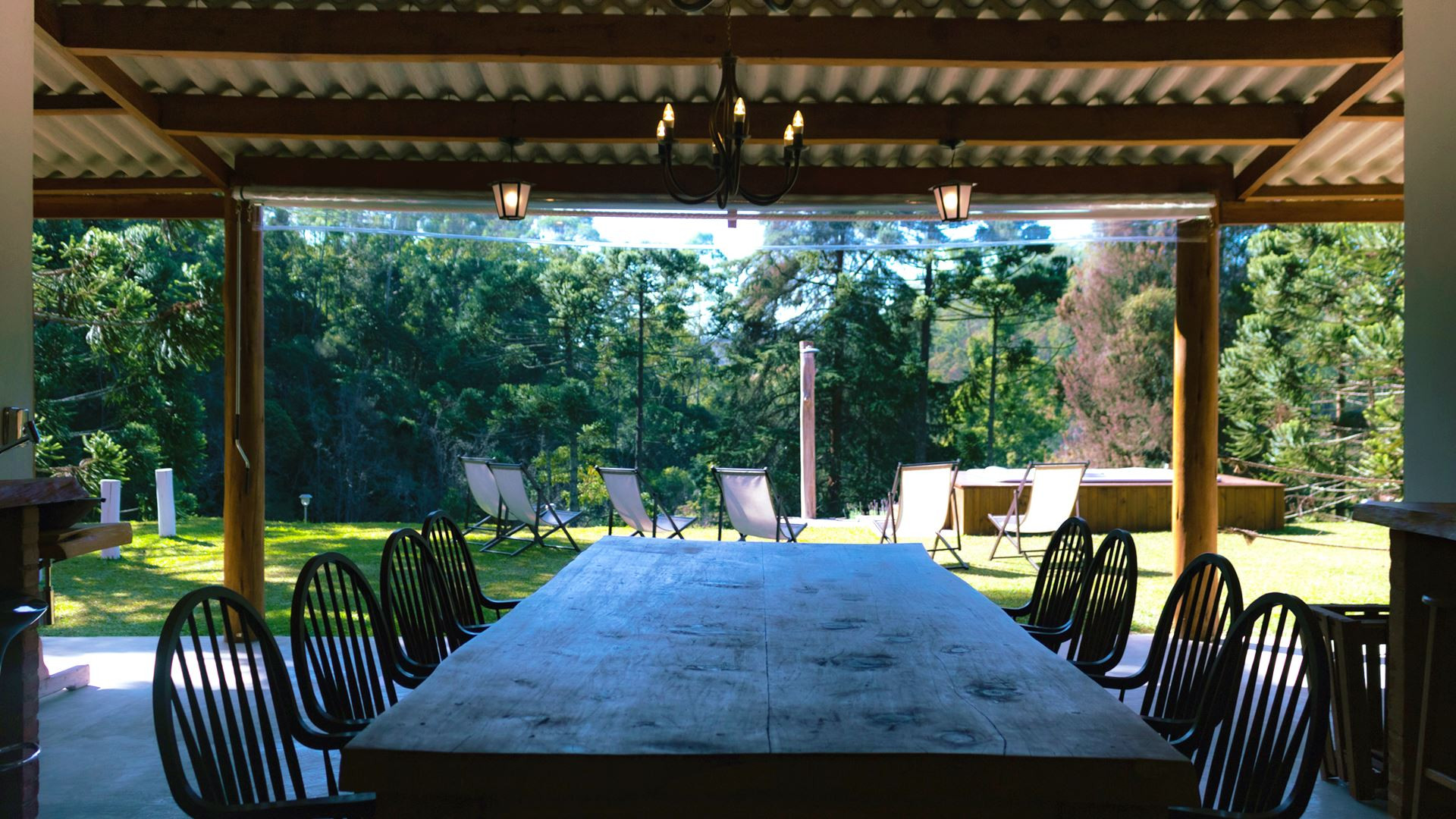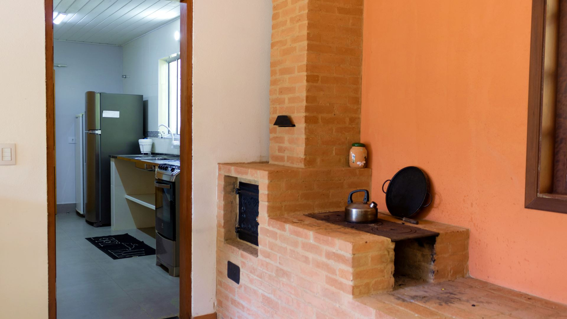 - Área gourmet ampla com fogão e forno a lenha, grande mesa de jantar e balcão com banquetas