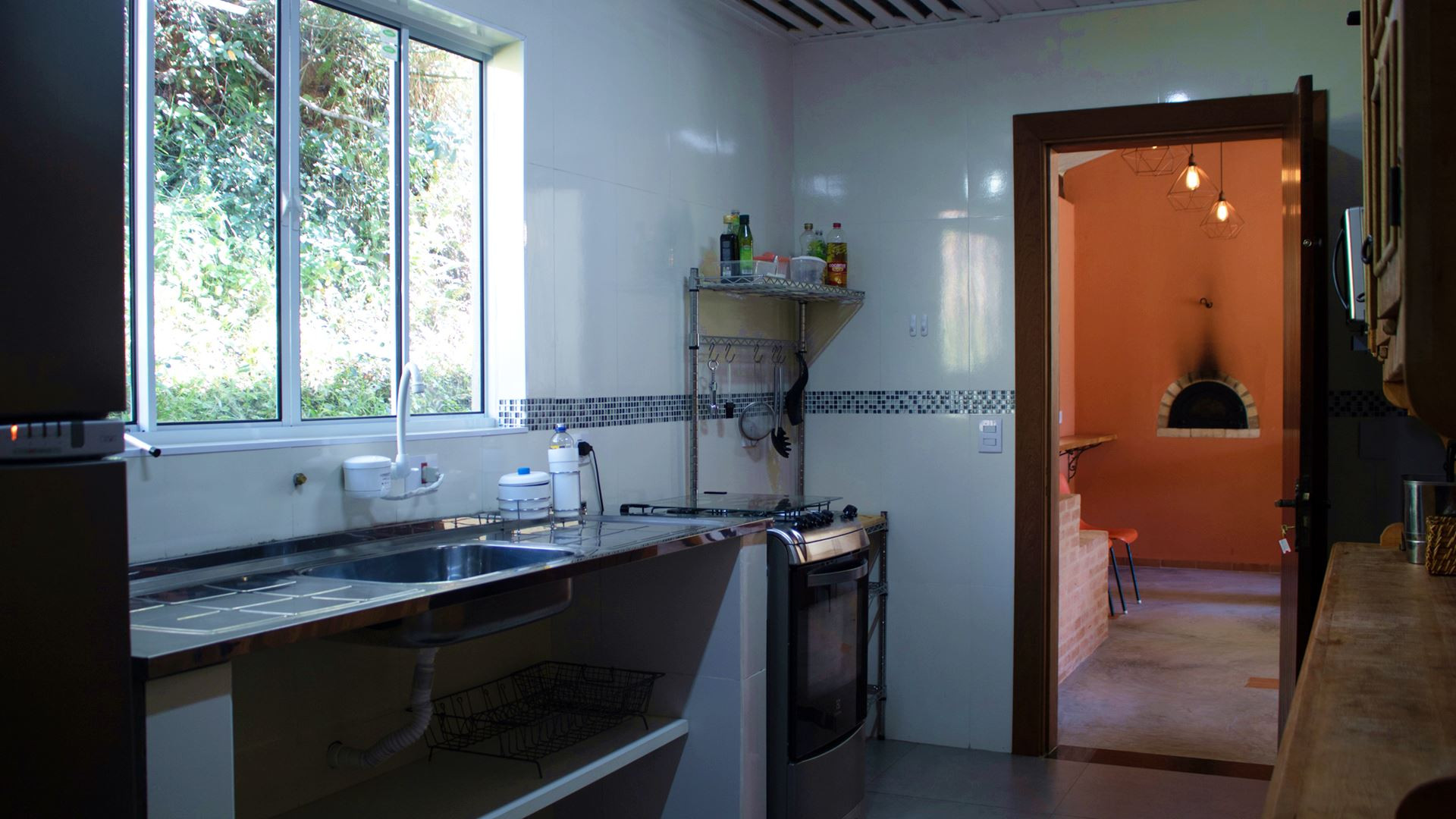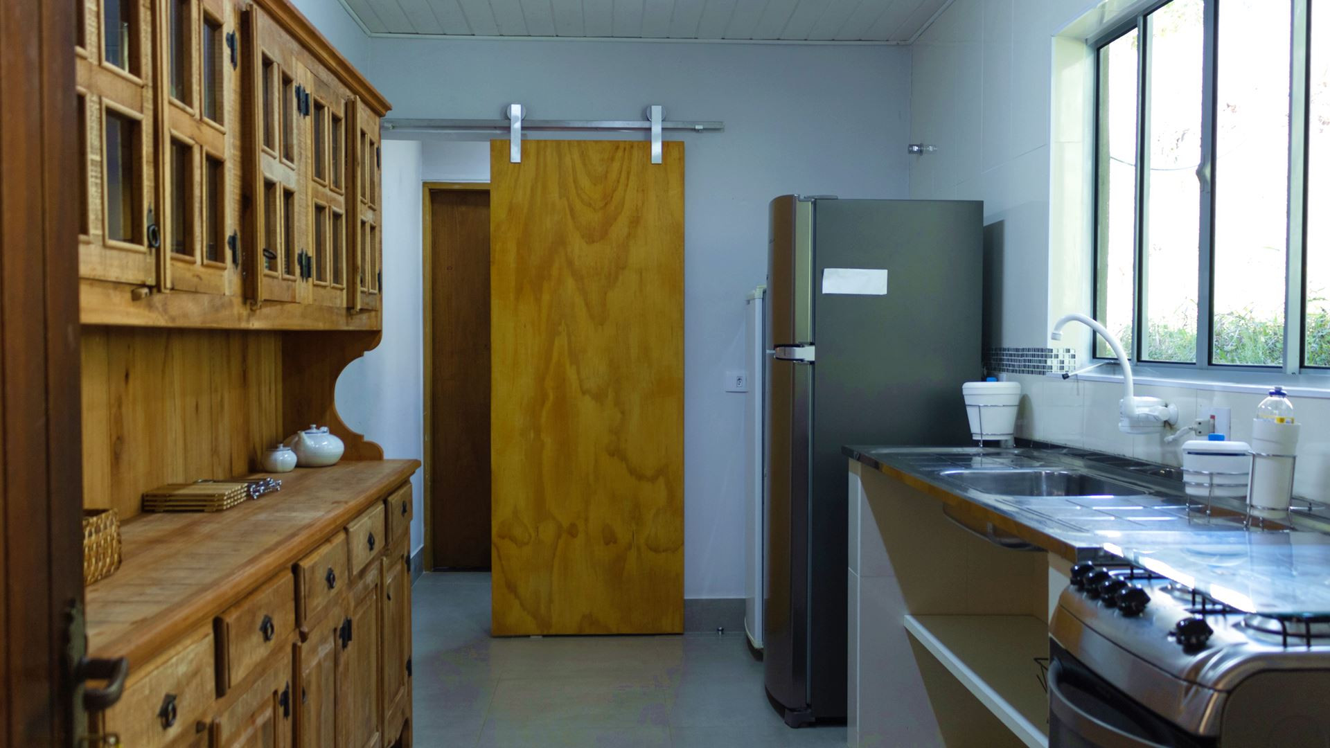 - A cozinha é simples, mas tem tudo que você precisa para preparar refeições, incluindo cafeteira, freezer, fogão, geladeira, liquidificador, micro-ondas, torradeira, sanduicheira e balcão