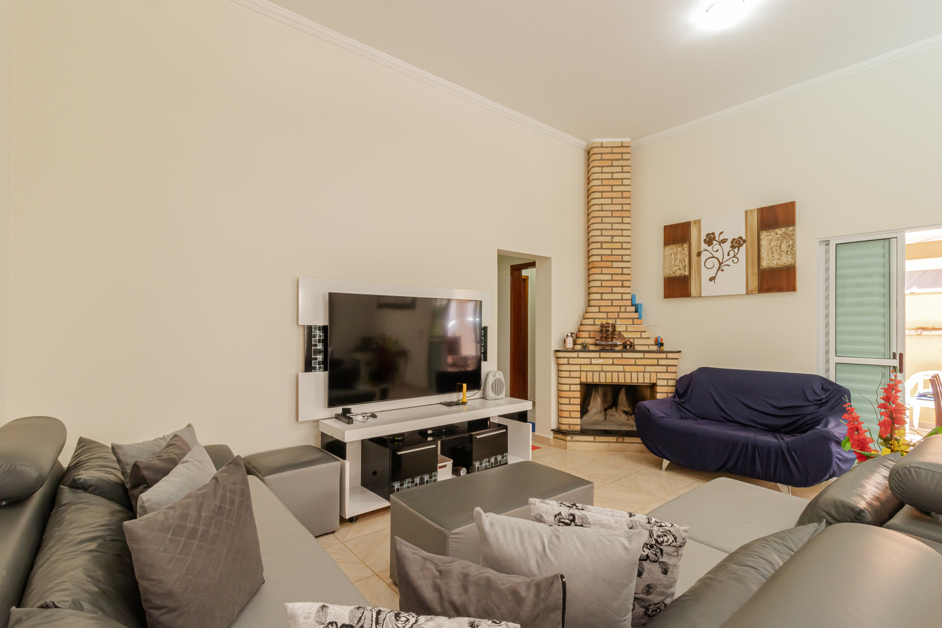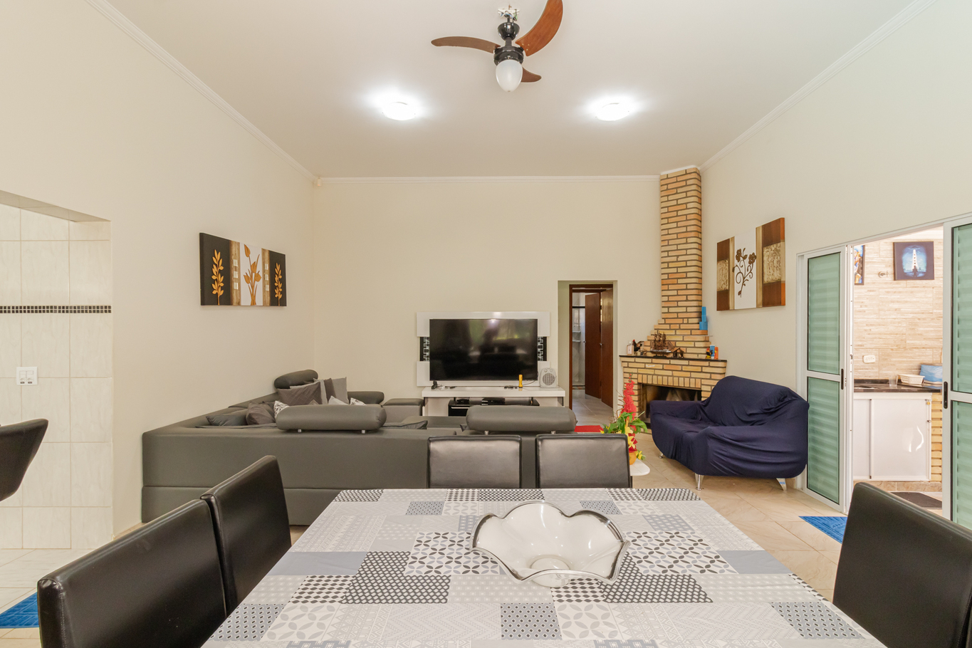 - Sala com mesa de jantar para 8 pessoas, sofá e Smart TV