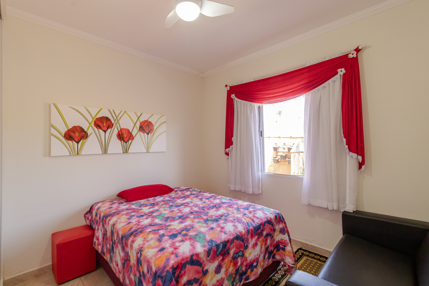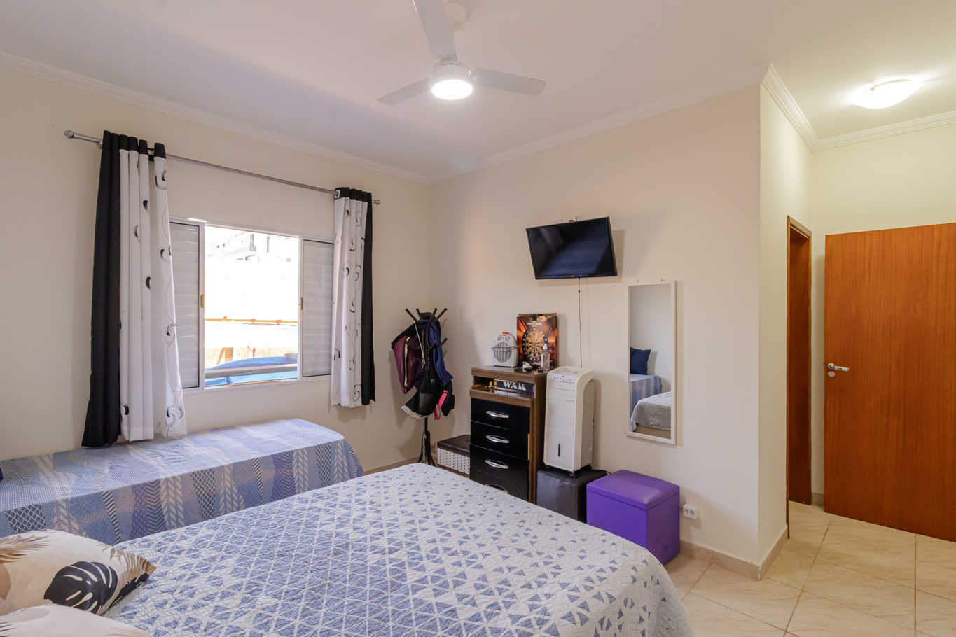 - Quarto 1 (suíte): cama de casal, armário, Smart TV, ventilador e banheiro privativo com box de vidro