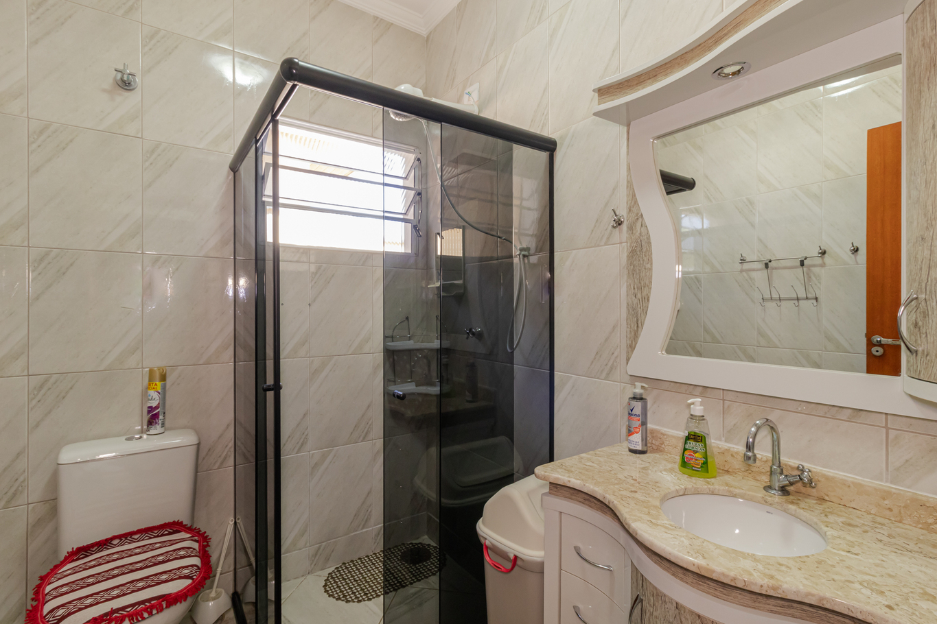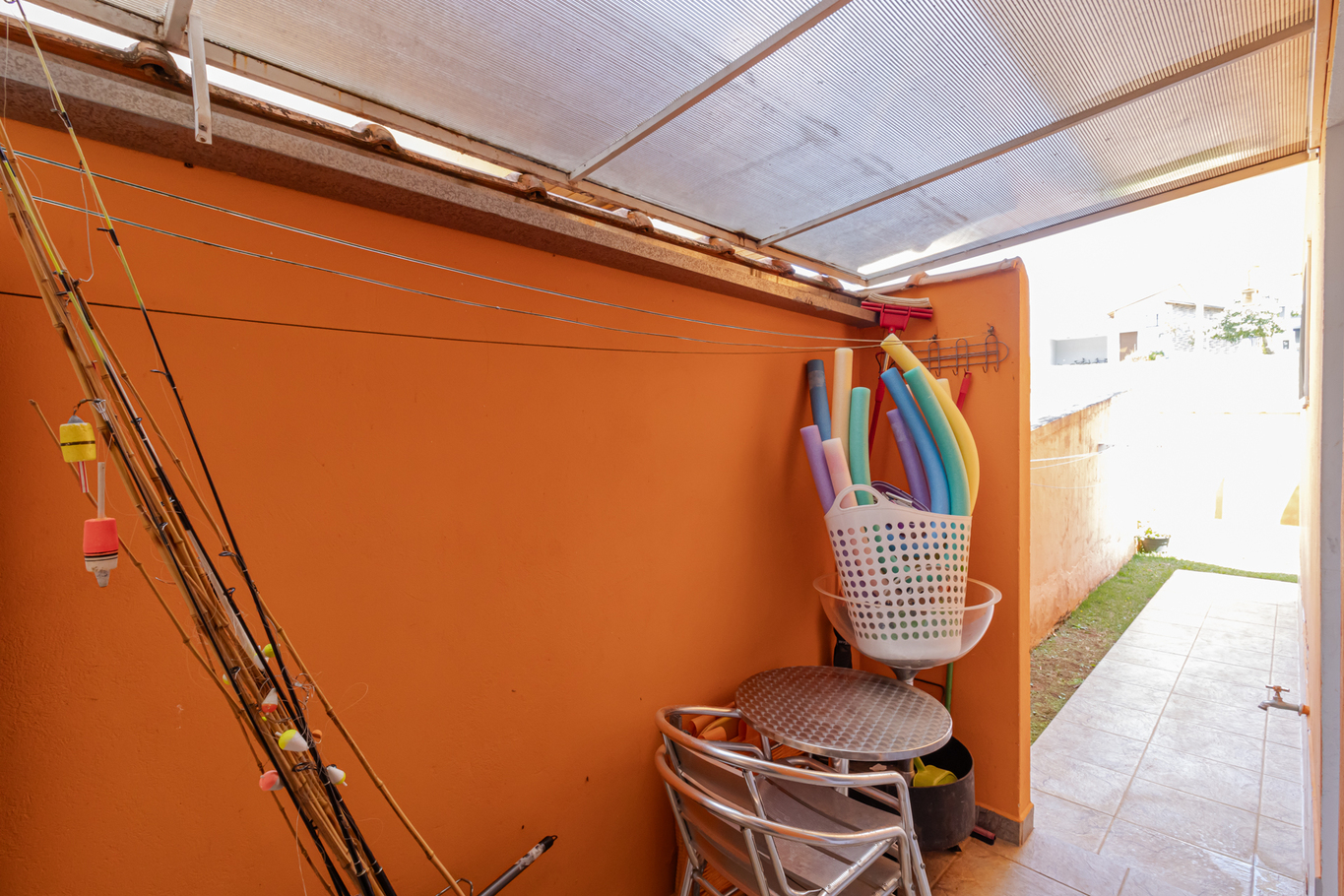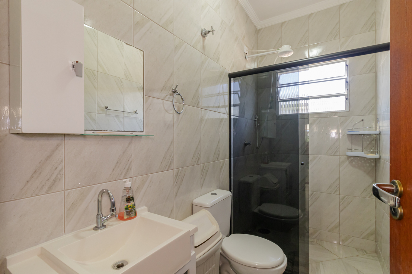- Banheiro social externo com chuveiro elétrico e box de vidro