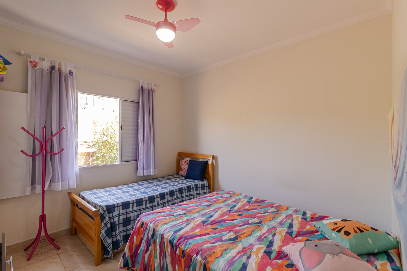 - Quarto 2 (suíte): cama de casal, cama de solteiro, armário, Smart TV, ventilador e banheiro privativo com box de vidro