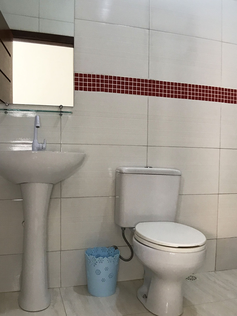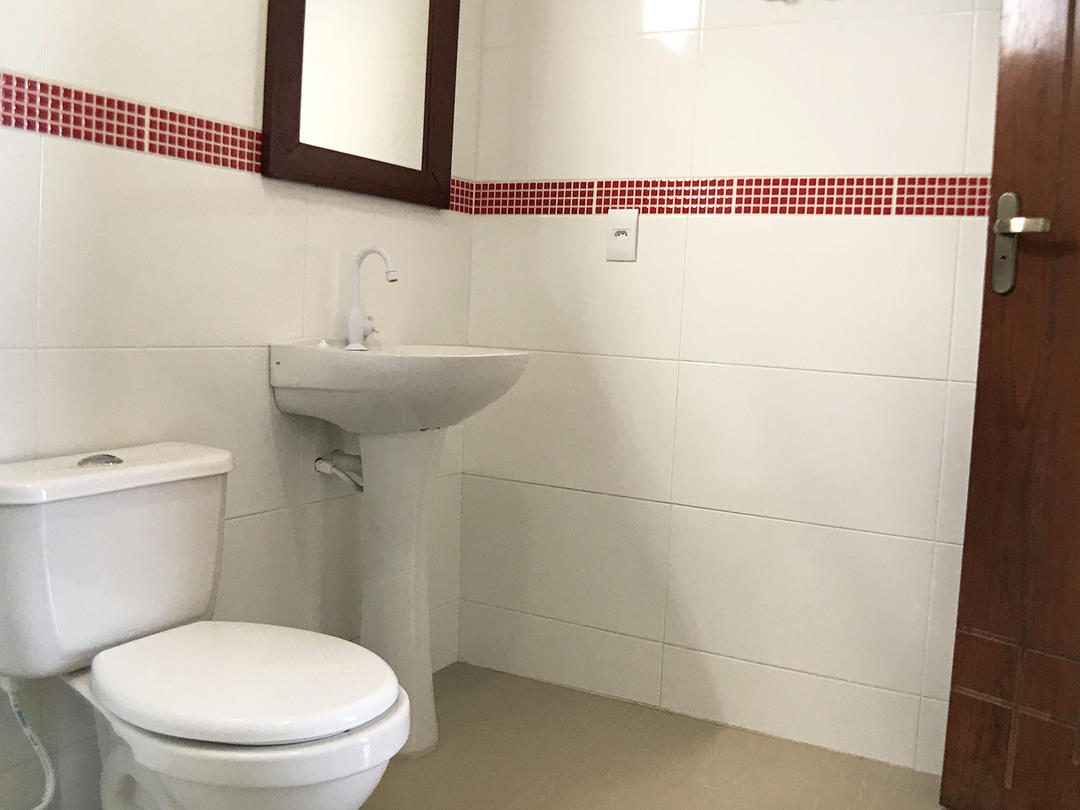 - Além do banheiro privativo da suíte, a casa conta com outros dois banheiros sociais com chuveiro elétrico